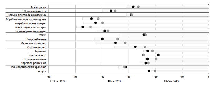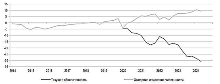 Согласно Банку России, проблема дефицита кадров различной квалификации усилилась в 2024 г. Обеспеченность работниками во II квартале 2024 г. снизилась до исторического минимума (-30,8%). Наиболее остро дефицит продолжали испытывать обрабатывающие предприятия, производящие продукцию инвестиционного и потребительского назначения.