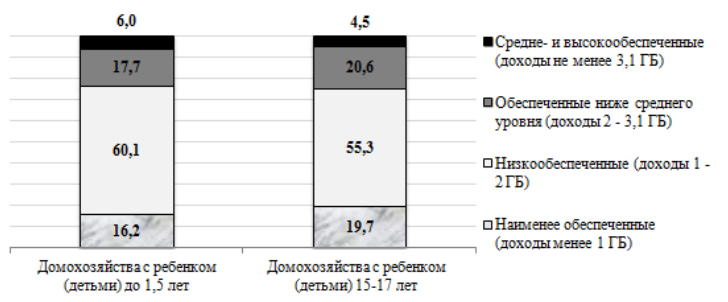 При этом по уровню душевых денежных доходов8 домохозяйства с ребёнком (детьми) до 1,5 лет и 15-17 лет находятся в сопоставимых условиях. Распределение в двух группах домохозяйств схоже – преобладают (55-60%) низкообеспеченные (с доходами от 1 до 2 границ бедности (ГБ)), наименее обеспеченные (доходы менее 1 ГБ) составляют 16-20%, а средне- и высокообеспеченные (доходы не менее 3,1 ГБ) – только 5-6% (рисунок 1). Соответственно, независимо от трудового положения домохозяйств (наличие и число работающих, уровень их доходов от занятости и пр.), наличия и уровня доходов из других источников помимо трудовой деятельности, перераспределение имеющихся доходов в домохозяйствах с учётом фактической иждивенческой нагрузки в целом примерно выравнивает ситуацию в двух рассматриваемых группах домохозяйств.