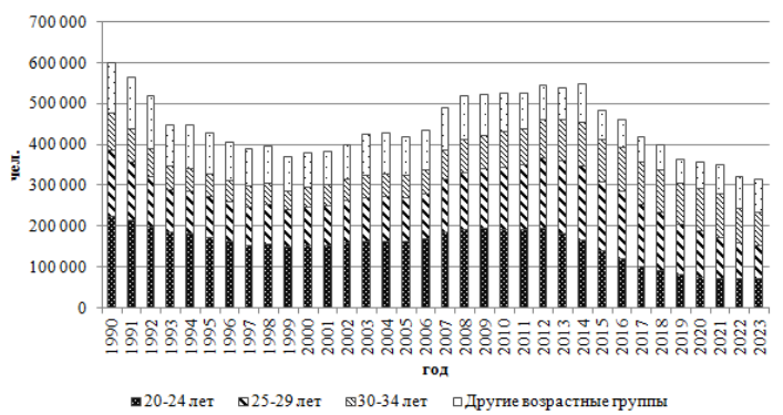 - за период 1990-2023 гг. вклад возрастной когорты 20-34 лет в формирование суммарного коэффициента рождаемости сельского населения в среднем составил 78,5%; доля данной когорты в общей численности женщин репродуктивного возраста на 1 января 1990 г. составляла 49,9% (3,9 млн чел.), на 1 января 2002 г. – 38,4% (3,6 млн чел.), на 1 января 2012 г. – 45,2% (3,9 млн чел.), на 1 января 2024 г. – 36,4% (2,8 млн чел.);