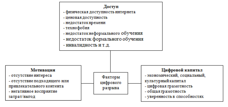 Согласно концепции Ragnedda [10], в основе цифрового разрыва лежит три основных группы факторов – мотивация, доступ и цифровой капитал (рисунок 1). Такая трёхфакторная модель объединяет как личностные, так и структурные факторы цифрового разрыва.