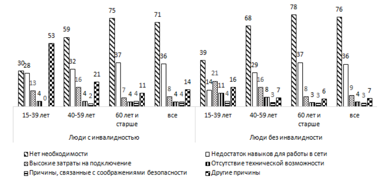 Рисунок 2. Причины неиспользования интернета людьми с инвалидностью и без таковой в разрезе возраста, % от численности тех, кто не пользуется Интернетом