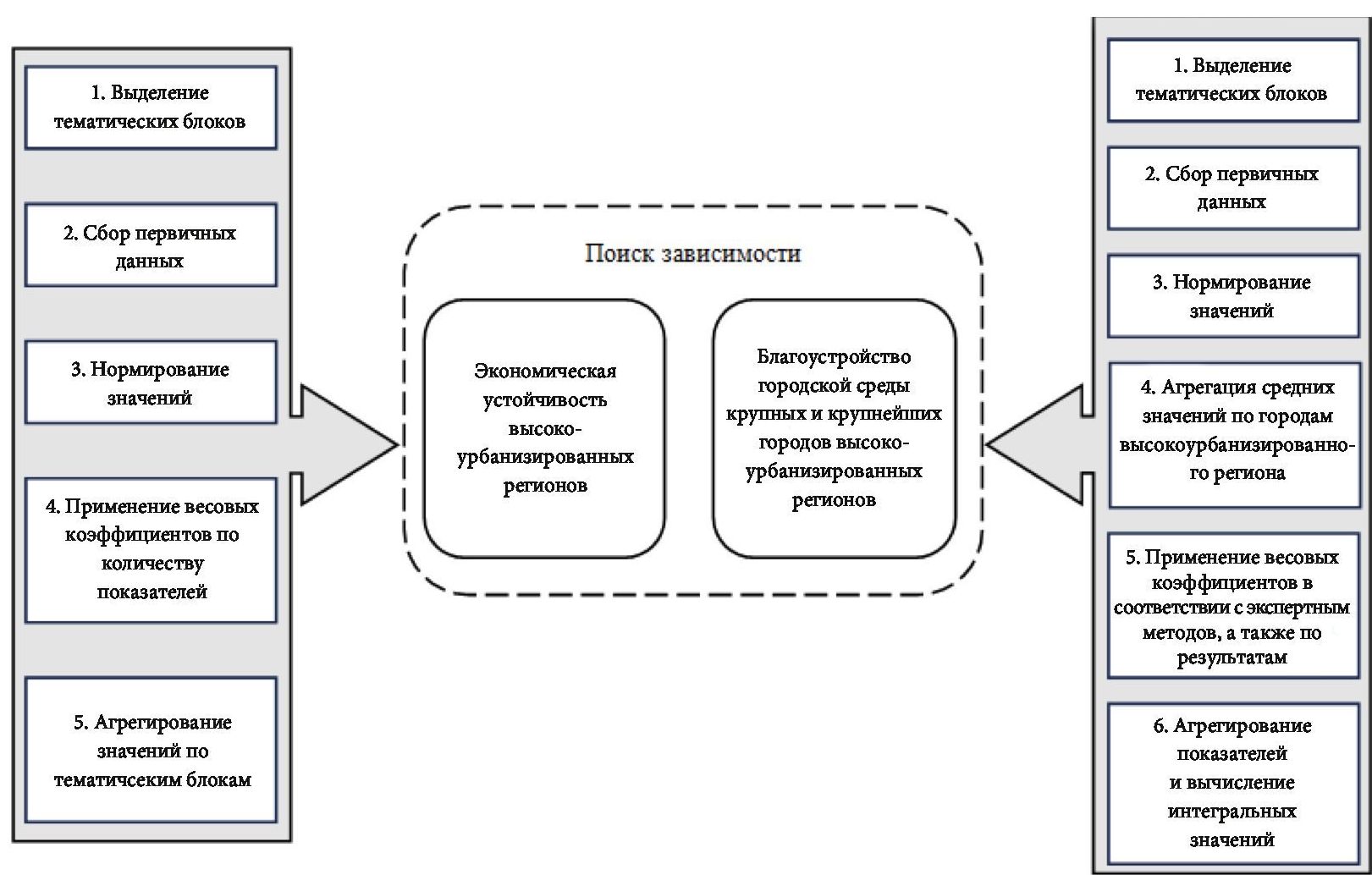 С целью поиска зависимости между проведением мероприятий по благоустройству городской среды и экономической устойчивостью необходимо выделить высокоурбанизированные регионы, отвечающие критериям, выделенным в рамках теоретической части исследования. Промежуточные значения о состоянии городской среды, а также методика расчёта соответствующих показателей, алгоритм применения которой представлен на рисунке 2, представлена в предыдущих работах авторов [33].