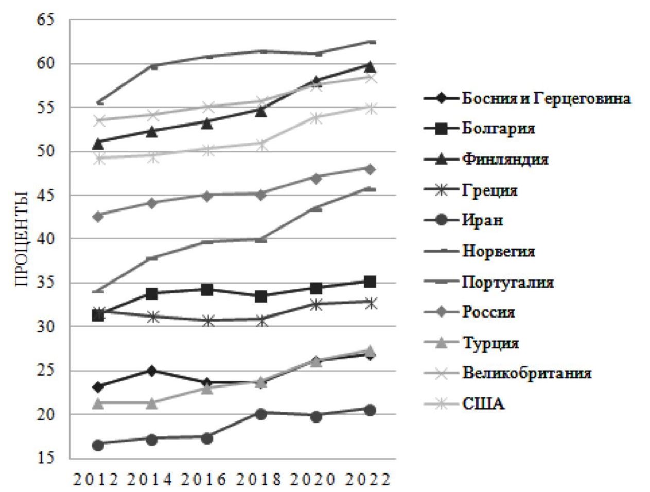 Рисунок 3. Доля «креативного класса» в процентах от занятых с 2012 по 2022 гг.
