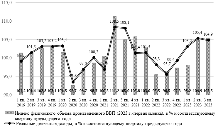 К 2024 году Россия подошла, как показывают предварительные данные государственной статистики, с позитивной динамикой важных социально-экономических показателей. Так, индекс физического объёма произведенного ВВП, определяющего экономическую основу для решения задач в сфере уровня жизни, составил в 2023 г. во 2-м квартале 104,9%, в 3-м квартале - 105,5%19 в годовом измерении (относительно соответствующего квартала предыдущего года) после непрерывного падения в предыдущие четыре квартала (рисунок 1).