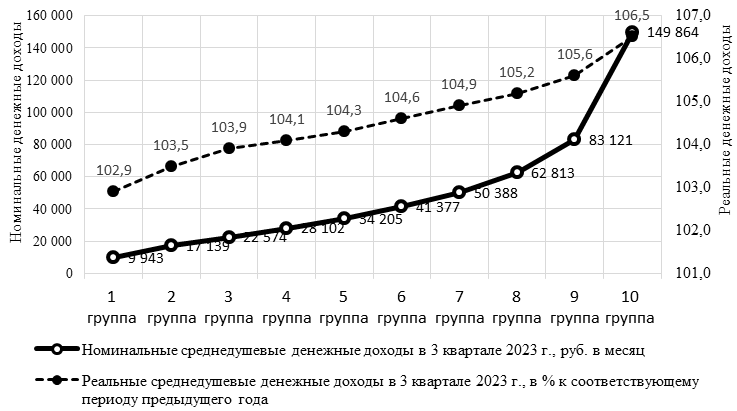 В 2023 г. вновь проявился рост неравенства в распределении денежных доходов населения, в то время как в 2022 г. коэффициент фондов (соотношение денежных доходов 10% наиболее и 10% наименее обеспеченного населения) зафиксировал его снижение – показатель уменьшился до 13,8 против 15,2 в 2021 году26. Так, в 3 квартале 2023 г. душевые денежные доходы в 1-ой децильной группе (с наименьшими доходами) составили 9943 руб., в 10-ой децильной группе (с наибольшими доходами) - 149864 руб. (рисунок 2). При этом в реальном выражении доходы в 1-ой децильной группе составили 102,9% к соответствующему кварталу 2022 г., в 10-ой децильной группе они были равны 106,5%. В январе-сентябре коэффициент фондов составил в 2023 г. 14,7, в 2022 г. за тот же период - 14,127.