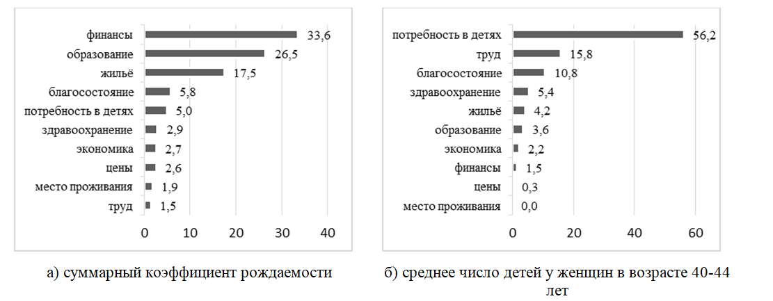 Результаты расчёта парциального вклада социально-экономических факторов на основе субъективных оценок населения на реализацию репродуктивных планов по двум зависимым переменным: а) фактическое число рождённых детей у женщин в возрасте 40-44 лет; б) суммарный коэффициент рождаемости по очерёдности рождения приведены на рисунке 3 и в таблице 5.