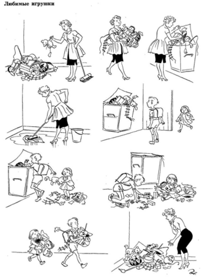 Целью данного эксперимента было изучение влияния ответного взгляда робота на его привлекательность для пользователя. В отличие от других экспериментов данной серии, в которых вводилась проблемная ситуация, совместно разрешаемая человеком и роботом, здесь мы решили исследовать ситуацию, в которой человек рассказывает роботу историю, а робот выступает в роли слушателя, демонстрируя различные способы ответного взгляда. В эксперименте приняли участие 46 испытуемых (средний возраст 27 лет, 33 женщины). В рамках эксперимента испытуемые должны были рассказать двум роботам истории по картинкам. В качестве стимульного материала мы использовали истории в картинках Херлуфа Бидструпа (Рис. 3), имеющие богатую практику применения в нейропсихологических экспериментах. Испытуемые получали каждую историю в виде набора разрозненных карточек. Они должны были составить связный сюжет и рассказать историю роботу: испытуемые рассказывали истории роботам по очереди, 3 истории каждому роботу. Порядок историй для каждого испытуемого выбирался случайно. В среднем испытуемые тратили на рассказ всех трех историй порядка 30 минут.
