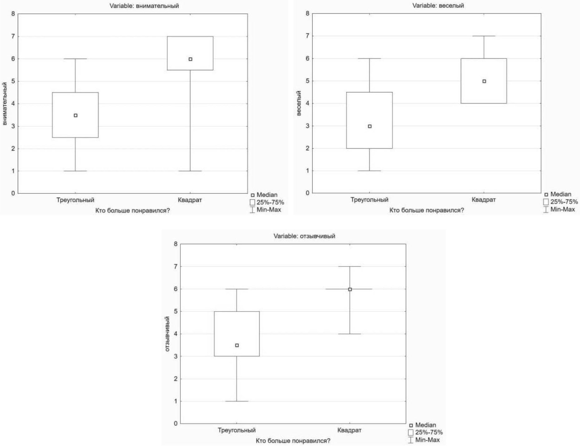 Мы разделили участников эксперимента на группы предпочтений: 26% людей (n = 12) предпочли «треугольного» робота, который отводит взгляд, 28% людей (n = 13) – «квадратного» робота, реагирующего на взгляд контактом глаза-в-глаза, и 46% (n = 21) одинаково оценили обоих роботов. Согласно дисперсионному анализу, предпочтение робота является существенным фактором, влияющим на оценку робота по шкалам семантического дифференциала (F(24, 62) = 1,9, p < 0,05). Испытуемые, выбравшие «треугольного» и «квадратного» роботов, согласно шкалам семантического дифференциала значимо отличаются друг от друга (p <0,01, U-тест Манна-Уитни) при оценке робота как отзывчивого, внимательного и веселого (Рис. 5).