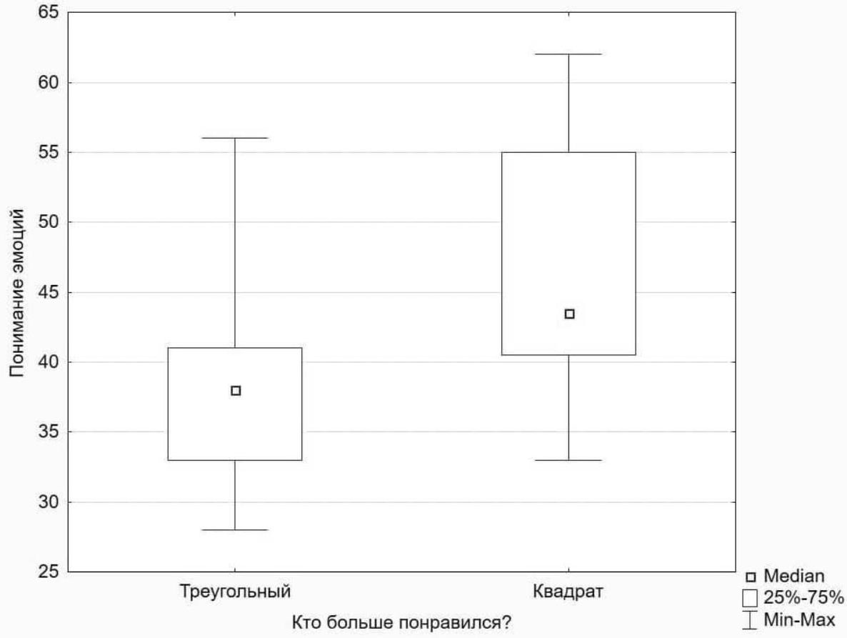 Согласно полученным результатам, уровень эмоционального интеллекта влияет на восприятие робота: те испытуемые, которые предпочли «квадратного» робота, отвечающего на взгляд пользователя ответным взглядом, обладали более высоким уровнем эмоционального интеллекта (p < 0,05, U-тест Манна-Уитни), чем группа, предпочитающая робота, избегающего взгляд (Рис. 7). Данное соответствие наблюдалось для конкретной шкалы – понимание чужих эмоций – по всем остальным шкалам теста эмоционального интеллекта испытуемые в двух группах не продемонстрировали значимых различий.