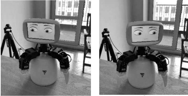 Такая установка обеспечивала более высокую точность системы распознавания пользователя, которая определяла ориентацию лица, а не сам взгляд. Испытуемый мог общаться с левым и правым роботом из одной и той же позиции за столом, поэтому роботы постоянно поддерживали соответствующее поведение: например, каждый робот отвечал на взгляд пользователя, даже если тот рассказывал историю другому роботу (Рис. 4). После эксперимента испытуемые должны были выбрать наиболее понравившегося им робота, а также оценить каждого робота по пятибалльной шкале привлекательности. Испытуемые также заполняли анкету, в которой описывали свои впечатления от взаимодействия с роботами, оценивали роботов по шкалам семантического дифференциала и проходили тест эмоционального интеллекта ЭмИн.