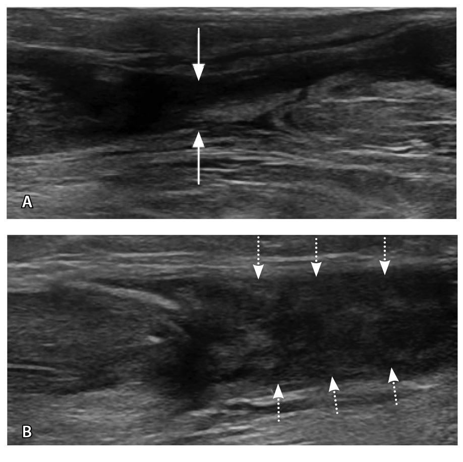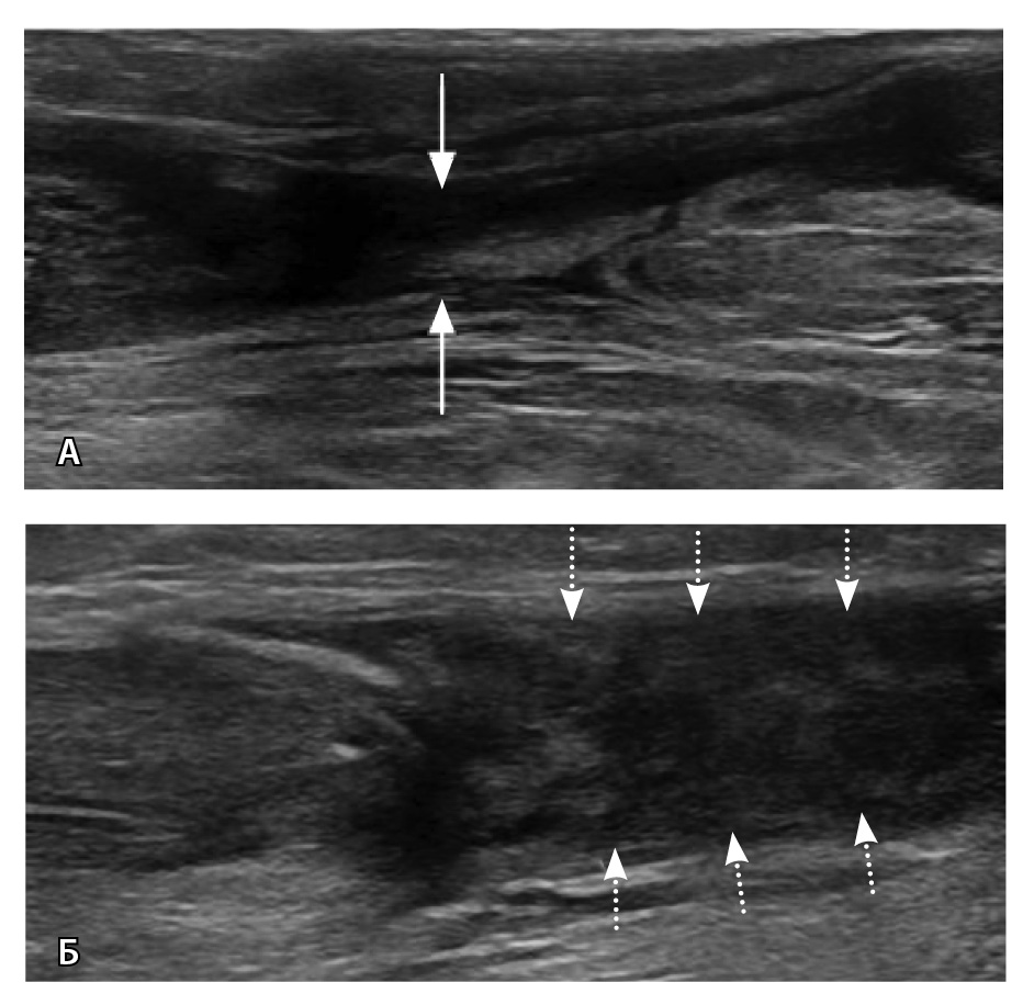 Рис. 6. Ультразвуковая диагностика голеностопного сустава: А – неполнослойный разрыв ахиллова сухожилия в области мышечно-сухожильного перехода (стрелки); Б – дефект 90% волокон, заполнен геморрагическим содержимым (пунктирные стрелки). Диастаз волокон, гематома