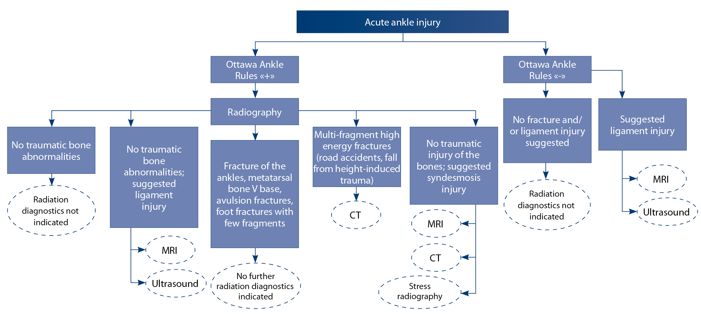Up to now, there have been no unified guidelines on the radiation diagnosis of ankle injury depending on the trauma type, mechanism, and severity. The Ottawa ankle rules (1994) are the basic guidelines for selection of the patients with acute trauma who should be offered X-rays. Primary X-ray would allow for the choice of the treatment strategy or further diagnostic assessment of the patient. Computed tomography is done for multi-fragment intra-articular fractures and for the control after their reposition. Computed tomography is used in patients with severe pain syndrome and other absolute and relative contraindications for magnetic resonance imaging. The latter allows for the imaging of all injured structures within a single assessment procedure and by such to make the diagnosis of ligament and tendon ruptures, to visualize osteochondral injuries, hidden and stress fractures and many other acute ankle injuries. Ultrasound assessment can considerably add to clinical understanding of the patient during acute trauma, if magnetic resonance imaging is contraindicated.