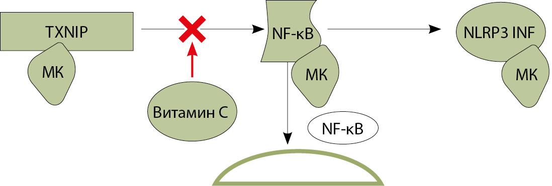 Изучение патогенетического механизма воспаления, вызванного МК, проиллюстрировало роль тиоредоксин-взаимодействующего белка (TXNIP) в передаче сигналов ядерного фактора-κB (NF-κB) и его взаимодействия с NOD-подобным рецепторным белком 3 (NLRP3), приводящего к активации инфламмасомы NLRP3. Белок TXNIP и воспаление, вызванное уратами, могут успешно подавляться витамином С в качестве антиоксиданта [22] (рис. 4).