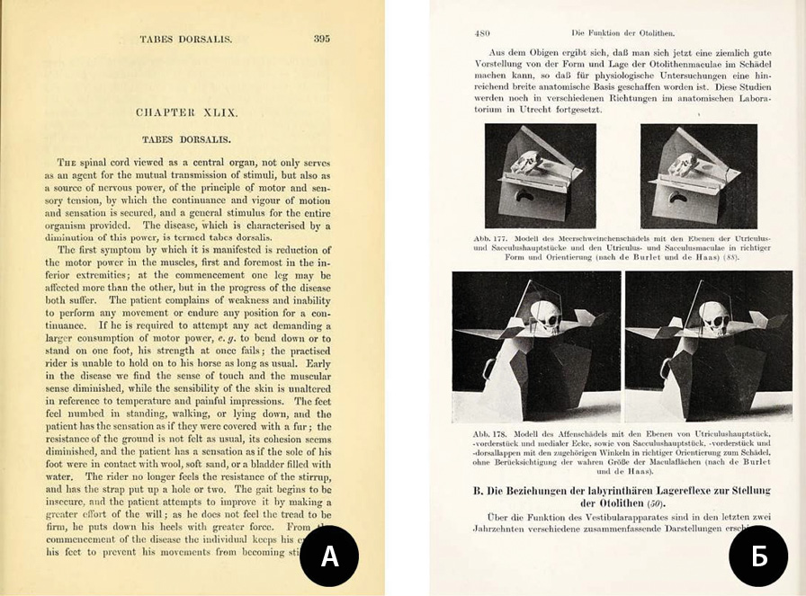 Рис. 1. Страницы из классических работ Moritz Heinrich Romberg [10] (A) и Rudolf Magnus [11] (Б)