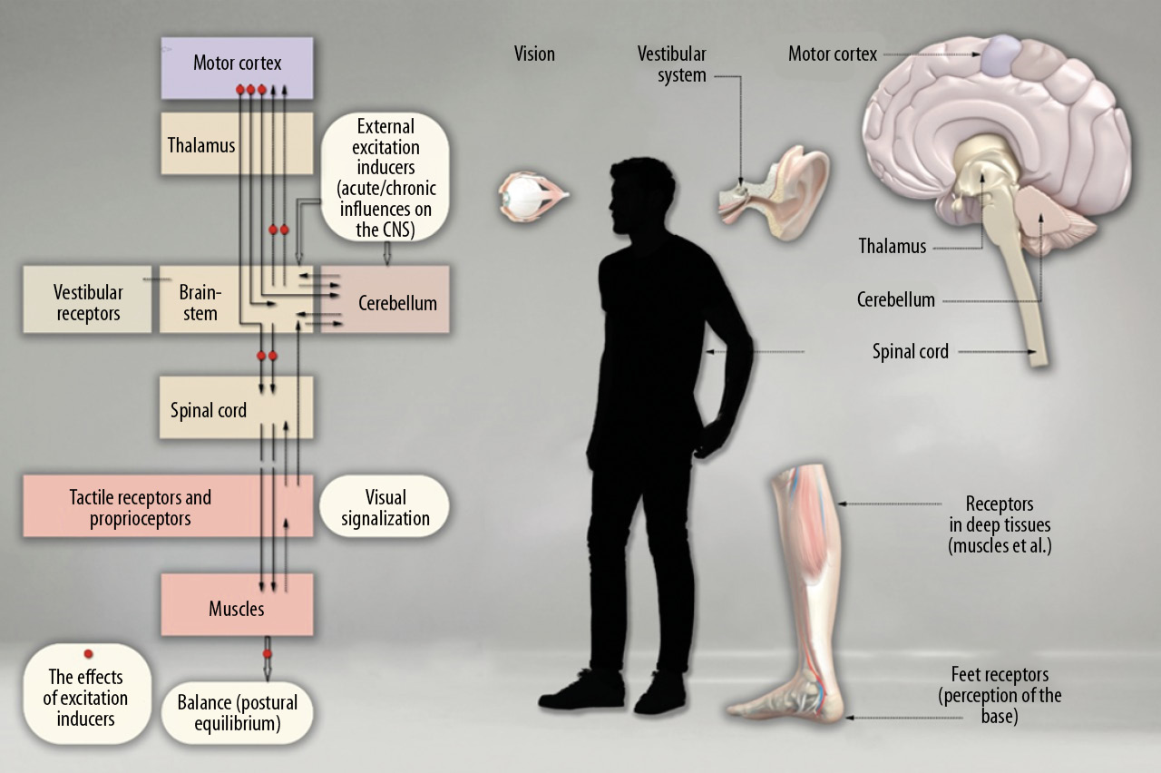 Разрабатываются и другие теории, в частности, большое значение придается интегративной роли центральной нервной системы и базальному мышечному тонусу [57]. Упрощенная схема регуляции вертикальной позы человека представлена на рис. 5, где красным отмечены возможные «точки приложения» возмущающих факторов.