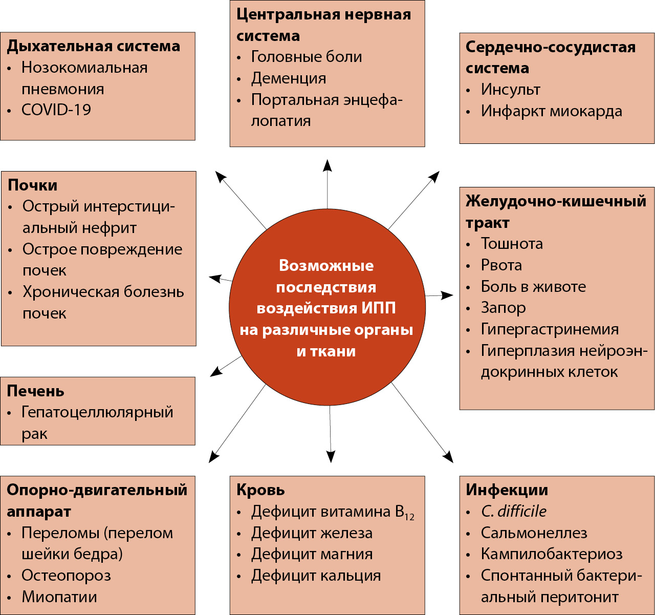 Рис. 1. Побочные эффекты длительного применения ингибиторов протонной помпы (ИПП) (модифицированная схема M. Yibirin и соавт. [6])