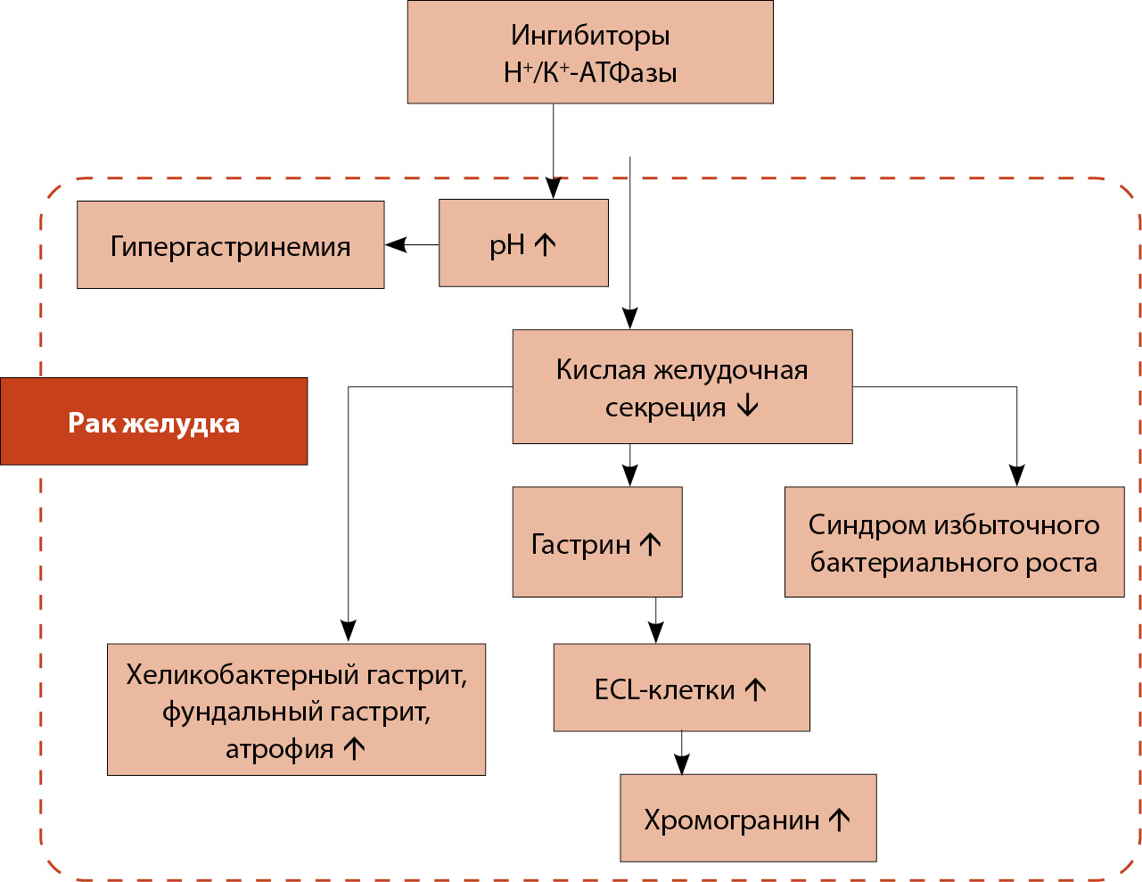 Среди наиболее значимых биологических факторов, объясняющих связь между использованием ИПП и раком желудка, выделяют гипергастринемию и гиперплазию ECL-клеток, обусловленные уменьшением выработки соляной кислоты на фоне блокады H+/K+-АТФазы париетальных клеток [16].