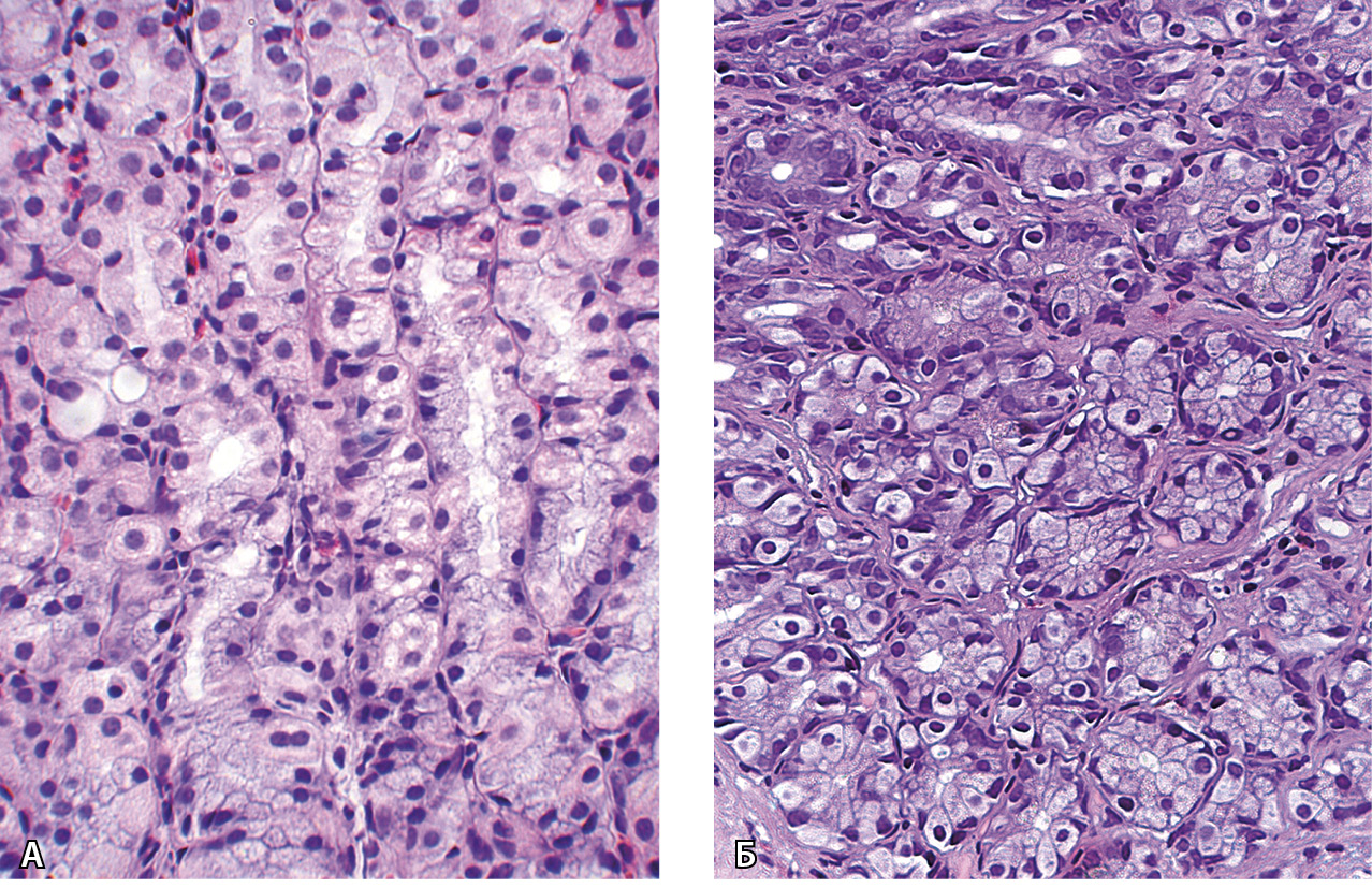 Рис. 3. Гастропатия, индуцированная приемом ингибиторов протонной помпы: дистрофия и вакуолизация париетальных клеток в главных железах желудка (А), гиперплазия нейроэндокринных клеток и участки пилорической метаплазии в главных железах желудка (Б). Окраска гематоксилином и эозином; × 500 (из личного архива С.Г. Хомерики)