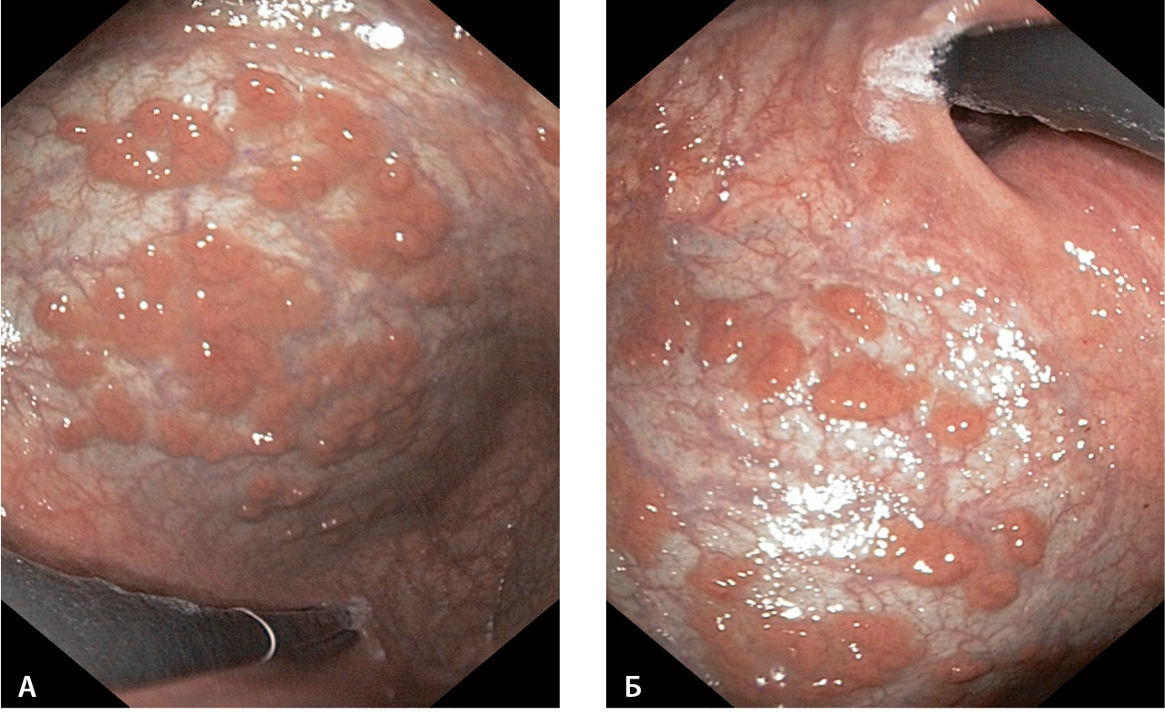 Рис. 4. Полипы фундальных желез: А – на фоне длительного (2,5 года) приема ингибиторов протонной помпы; Б – сохраняющиеся через 3 года после отмены приема ингибиторов протонной помпы (из личного архива Н.М. Хомерики)