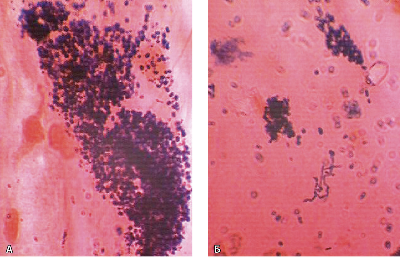 Рис. 5. Дрожжеподобные грибы (А) и псевдомицелий Candida albicans (Б) в желудочной слизи на фоне приема ингибиторов протонной помпы. Окраска по Граму; × 1200 (из личного архива С.Г. Хомерики)