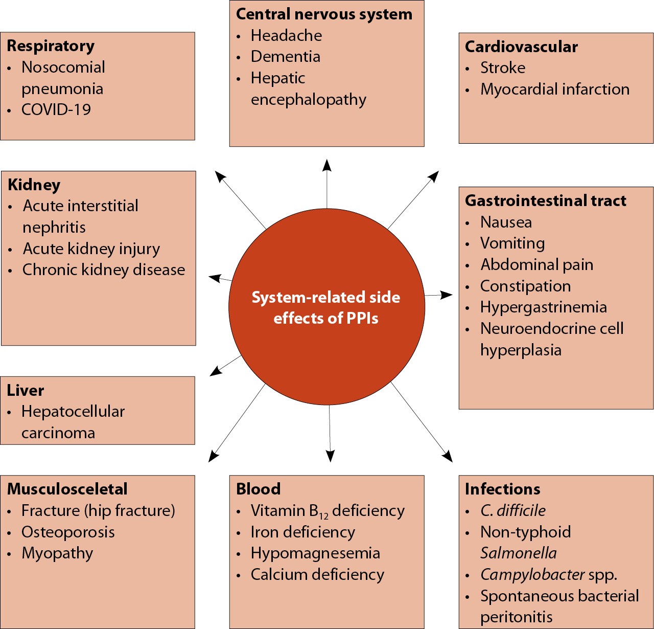 Нежелательные явления, развившиеся на фоне терапии ИПП, можно классифицировать в зависимости от наличия/отсутствия связи с подавлением выделения желудочного сока. При уменьшении кислотности желудочного сока снижается рН-зависимая абсорбция кальция, магния, железа и витамина В12, возникают симптомы, характерные для недостатка этих элементов. Примерами исходов применения ИПП, не связанных с подавлением кислотности, служат аллергические реакции, лекарственные взаимодействия, острый интерстициальный нефрит, развитие пневмонии, хроническое заболевание почек [26], неблагоприятные сердечно-сосудистые события, деменция, риск развития сахарного диабета 2-го типа [27], повышенный риск ревматоидного артрита у женщин [28] и др. Вместе с тем наиболее вероятным объяснением повышенного риска респираторных инфекций представляется индуцированная ИПП гипохлоргидрия, которая приводит к аспирации желудочного содержимого, что увеличивает бактериальную колонизацию легких с последующим развитием пневмонии [7].