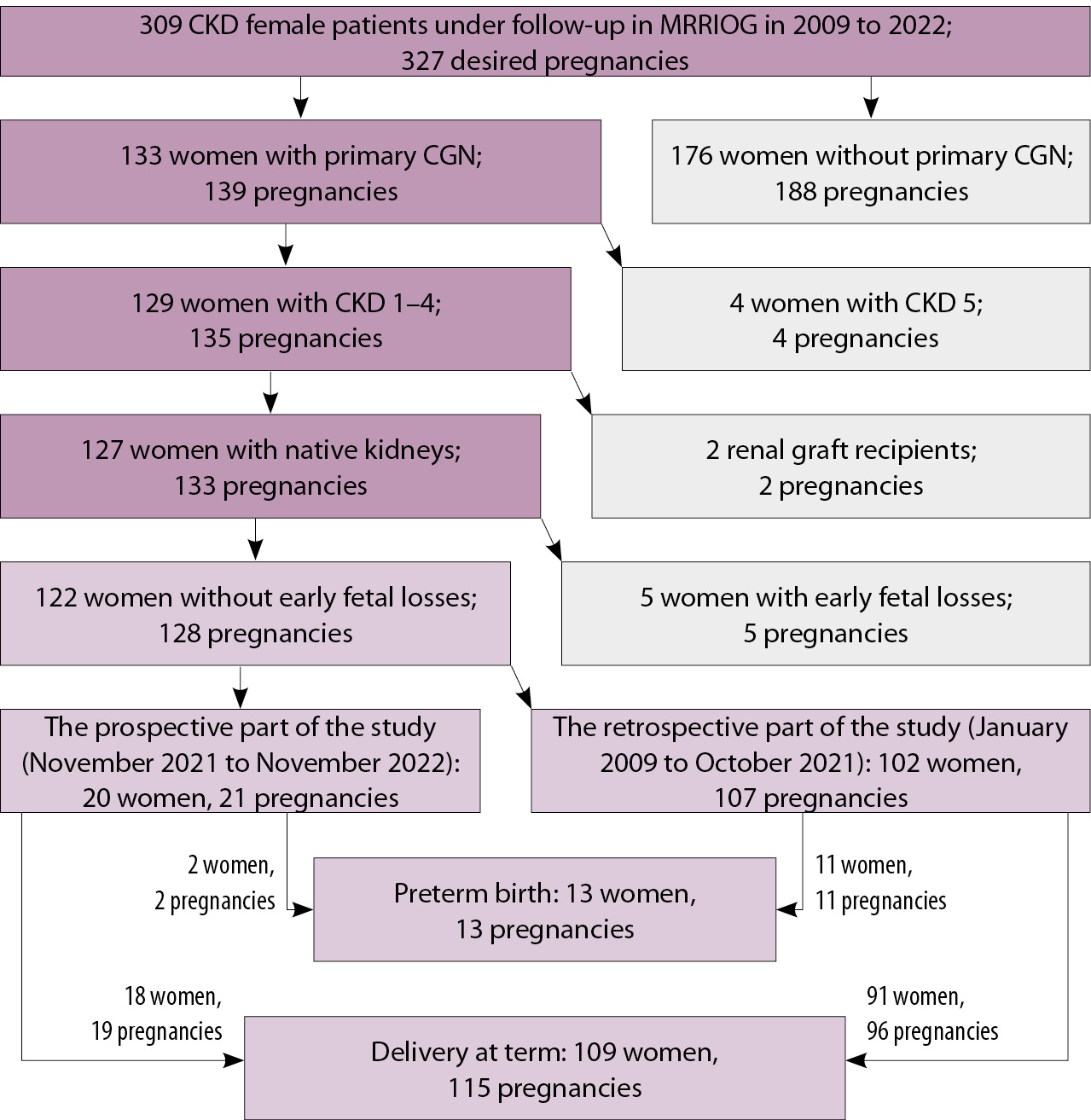 В исследование включены 122 пациентки с ХГН, у которых в период с января 2009 по ноябрь 2022 г. произошло 128 родов. Каждая беременность, закончившаяся родами, рассматривалась как независимый случай. Пациентки находились на амбулаторном наблюдении и/или стационарном лечении в Московском областном научно-исследовательском институте акушерства и гинекологии и Московском областном научно-исследовательском клиническом институте им. М.Ф. Владимирского. Ведение пациенток на этапе планирования беременности, во время гестации и в послеродовом периоде осуществляли совместно нефролог и акушер-гинеколог.