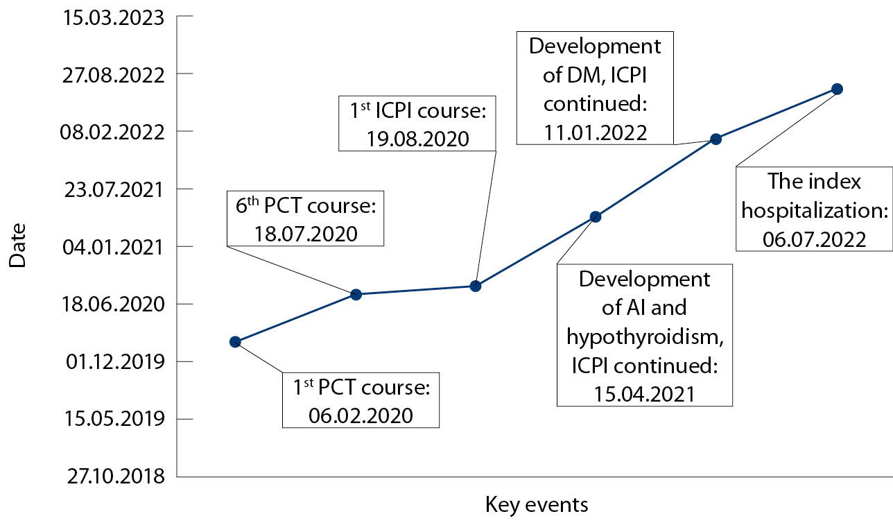 Эндокринные ИОНЯ чаще диагностируются в первые месяцы применения ИКТИО (обычно в течение 1–6 месяцев от первого введения ИКТИО) [12, 18, 19]. В нашем случае первичный гипотиреоз и вторичная надпочечниковая недостаточность манифестировали через 9 месяцев от начала иммунотерапии, фульминантный сахарный диабет – через 18 месяцев.