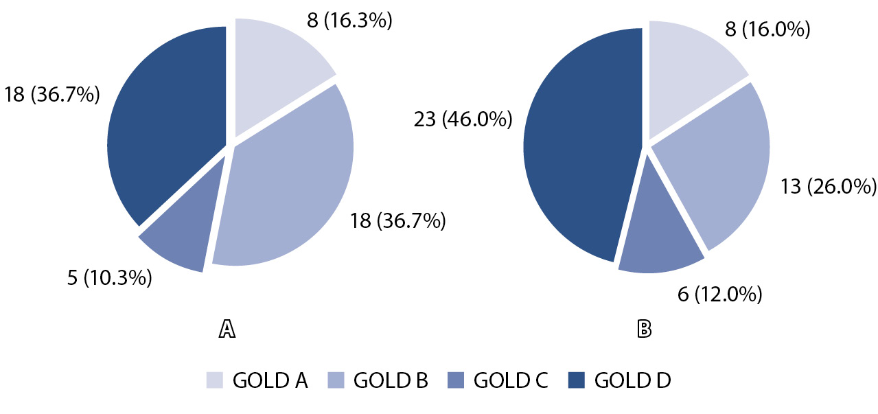 Рис. 1. Распределение пациентов в группах исследования по тяжести хронической обструктивной болезни легких (ХОБЛ) по шкале GOLD: А – ишемическая болезнь сердца (ИБС) + ХОБЛ, Б – ХОБЛ