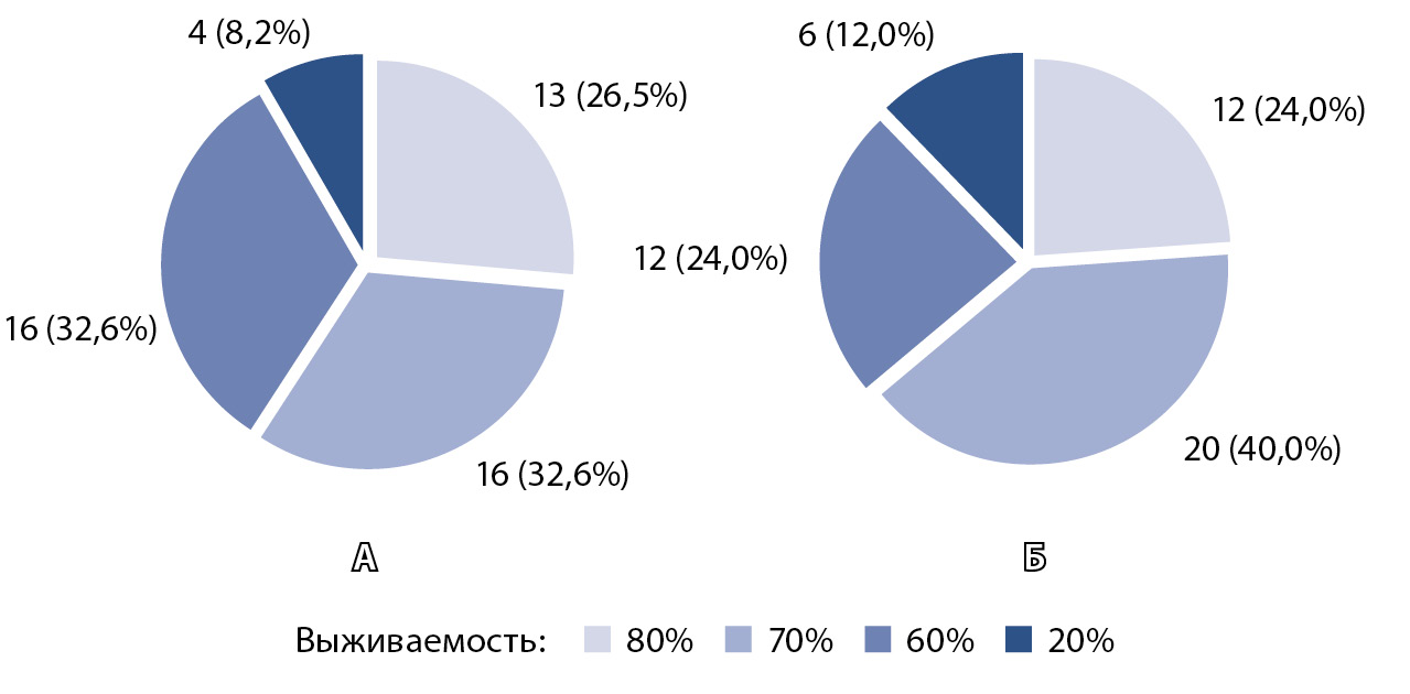 Рис. 2. Распределение пациентов в группах исследования по индексу BODE: А – ишемическая болезнь сердца (ИБС) + хроническая обструктивная болезнь легких (ХОБЛ), Б – ХОБЛ