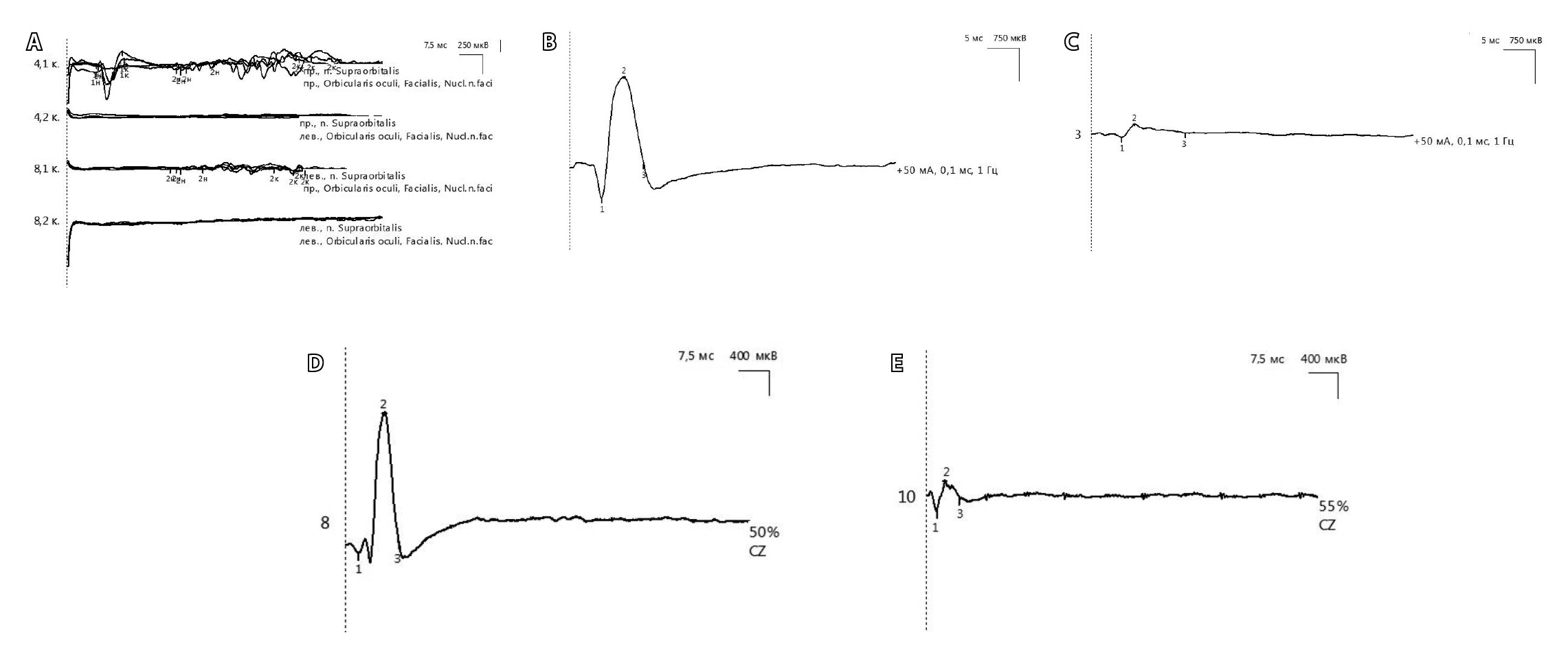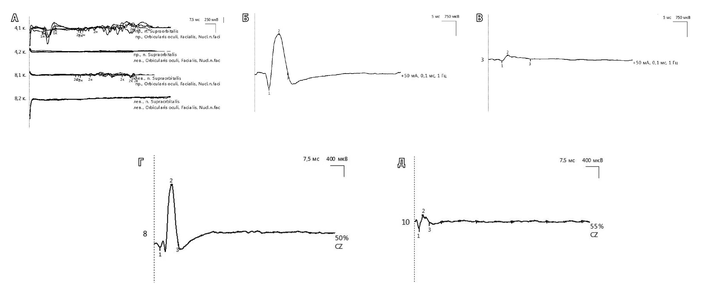 Рис. 1. Данные мигательного рефлекса (А), стимуляционной электронейромиографии (ЭНМГ) (Б, В) и транскраниальной магнитной стимуляции (ТМС) лицевого нерва (Г, Д) у мальчика 7 лет, выполненных на 12-й день от дебюта невропатии левого лицевого нерва, степень прозопареза – 4 балла по шкале Хауса – Бракмана. ЭНМГ-коэффициент 11%, ТМС-коэффициент 23%. А – мигательный рефлекс. Отсутствие регистрации раннего R1 (кривая 8.2) и позднего R2 (кривая 8.2) ипсилатеральных компонентов при стимуляции левого надглазничного нерва, позднего контралатерального компонента R2 (кривая 4.2) при стимуляции правого надглазничного нерва. Показатели мигательного рефлекса противоположной стороны (4.1, 8.1) в пределах возрастной нормы. Б – моторный ответ m. nasalis здоровой стороны амплитудой 2,7 мВ. В – моторный ответ m. nasalis пораженной стороны амплитудой 0,3 мВ. Г – вызванный моторный ответ m. nasalis здоровой стороны амплитудой 2,2 мВ. Д – вызванный моторный ответ m. nasalis пораженной стороны амплитудой 0,5 мВ