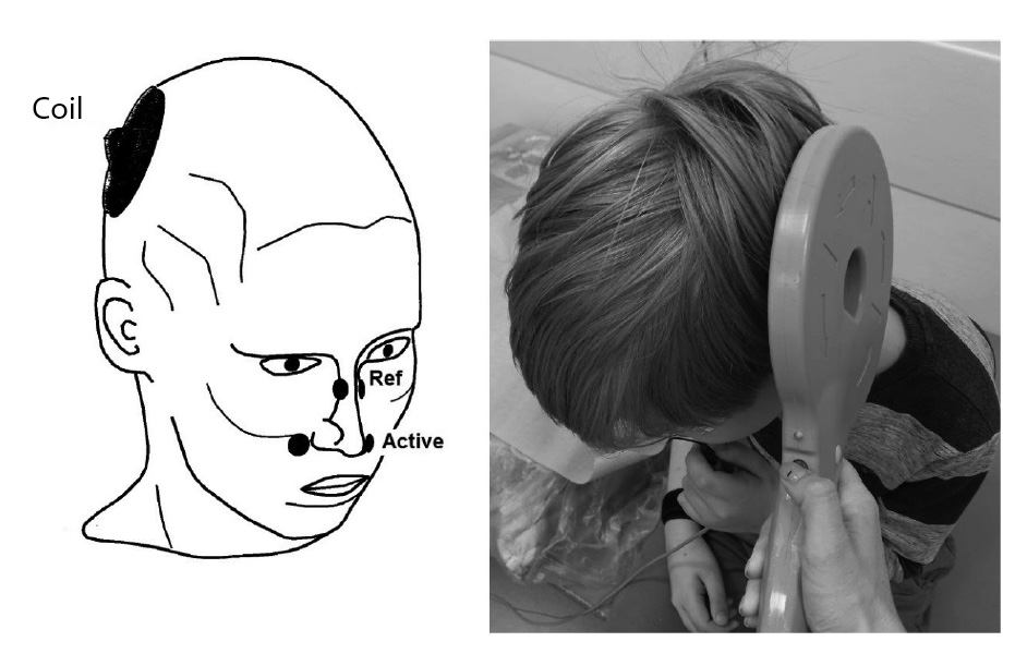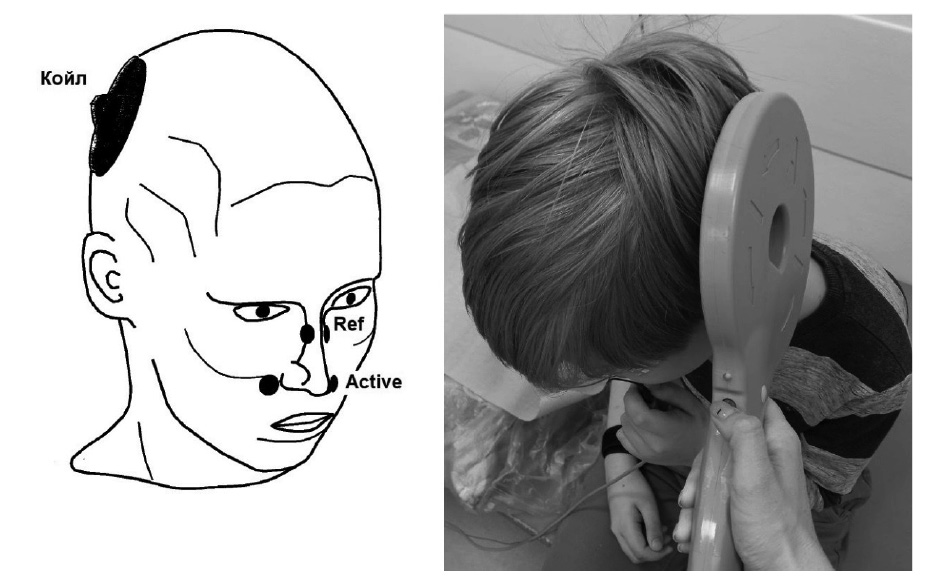 При проведении периферической ТМС ЛН используется стандартный кольцевой койл диаметром 9 см, который позволяет зарегистрировать достоверный, воспроизводимый ВМО с мимических мышц. Койл в виде «восьмерки» и кольцевой койл меньшего диаметра не применяются, что связано с меньшей мощностью производимого стимулирующего разряда при существующих анатомо-функциональных особенностях детского возраста. Для регистрации ВМО проводят супрамаксимальную стимуляцию с определением его порога (минимальная мощность индуктора, при которой регистрируется воспроизводимый ВМО амплитудой 50–100 мкВ) в затылочно-теменной области ипсилатерально исследуемой мышце (центр койла на 3 см кзади и 6 см латеральнее точки Cz по системе «10–20») (рис. 2). Регистрируют ВМО с максимальной амплитудой и минимальной латентностью, который воспроизводится в трех сериях стимуляции (рис. 1В, Г).