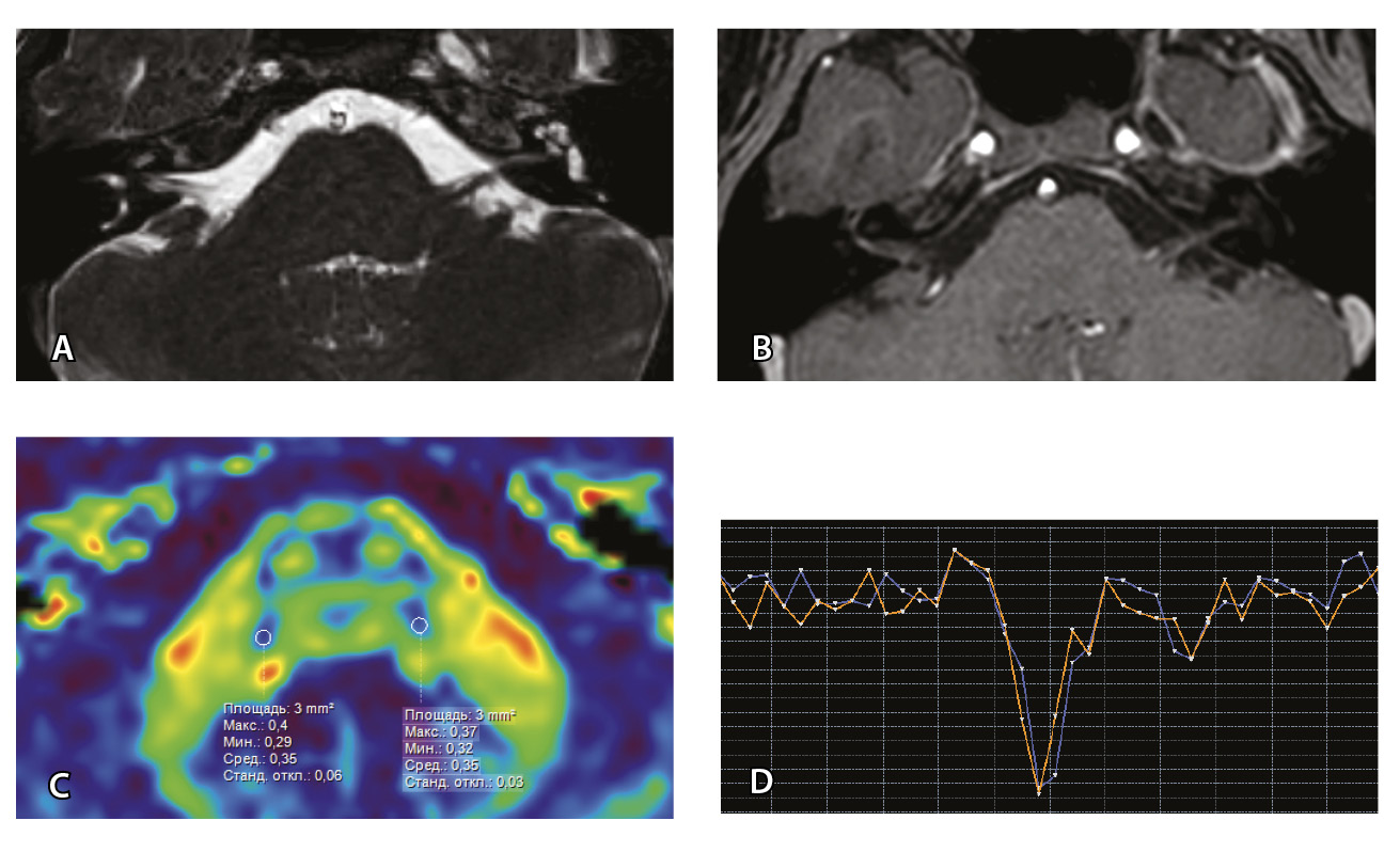 Дополнительно используются субмиллиметровые тонкосрезовые Т2-ВИ высокого разрешения для оценки черепных нервов (SSFP с толщиной среза 0,5 мм). Для оценки структур внутреннего уха были получены Т1-ВИ (3D_T1_ DIXON) с толщиной среза 1 мм (TR – 7 мс; TE – 4 мс; flip angle – 10°).