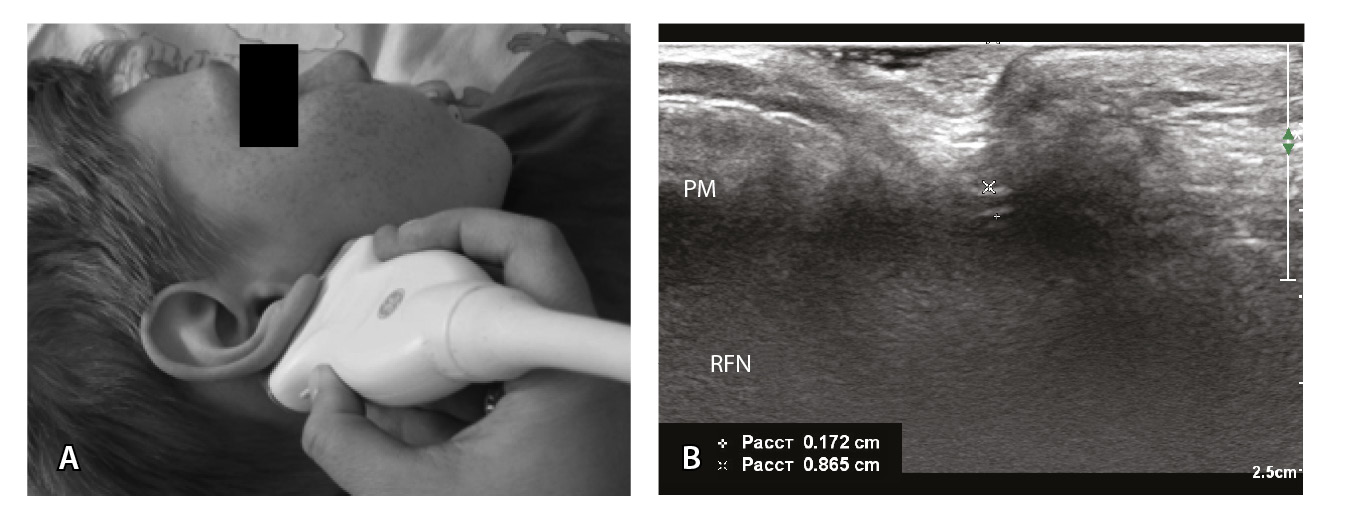 ЭНМГ и периферическая ТМС лицевого нерва выполняются по стандартным методикам. Оцениваются показатели мигательного рефлекса, амплитуды М-ответов и ВМО носовой мышцы (m. nasalis) здоровой и пораженной стороны, их соотношение в виде ЭНМГ- и ТМС-коэффициентов. С помощью УЗИ не только определяется диаметр ЛН пораженной и здоровой стороны, но также проводится сравнение показателей глубины залегания ЛН в области шилососцевидного отверстия с двух сторон. УЗИ лицевого нерва выполняется с использованием высокочастотного линейного датчика 18 МГц, в норме в области выхода из шилососцевидного отверстия нерв представлен трубчатой гипоэхогенной структурой с гиперэхогенными стенками. Методика сбора УЗ-показателей (диаметра и глубины залегания ЛН) представлена на рис. 4. Для сбора усредненных значений исследование проводится в наиболее толстой части ЛН с включением гиперэхогенных стенок при трехкратном повторном измерении.