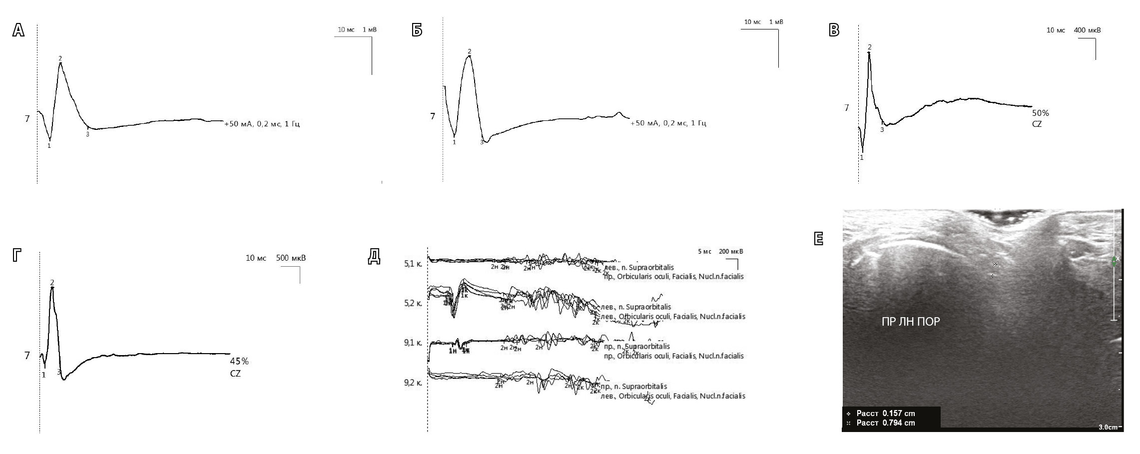 Рис. 5. Нейрофизиологические данные и результаты ультразвукового исследования лицевого нерва у пациентки З. 14 лет с невропатией правого лицевого нерва (исследование на 14-й день от дебюта). А. – М-ответ m. nasalis пораженной стороны амплитудой 1,9 мВ (коэффициент электронейромиографии 95%); Б – М-ответ m. nasalis здоровой стороны амплитудой 2,0 мВ; В – вызванный моторный ответ m. nasalis пораженной стороны амплитудой 1,7 мВ; Г – вызванный моторный ответ m. nasalis здоровой стороны амплитудой 2,2 мВ; Д – по данным мигательного рефлекса увеличение латентности R1-компонента на стороне поражения; Е – результаты ультразвукового исследования правого лицевого нерва (пораженная сторона, ПР ЛН ПОР): диаметр 1,57 мм, глубина залегания 7,94 мм