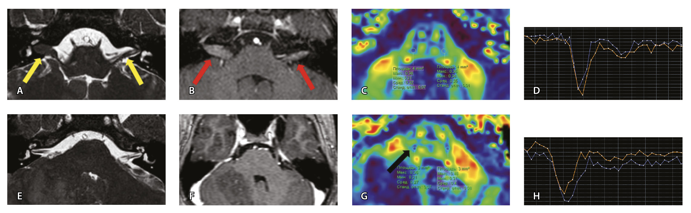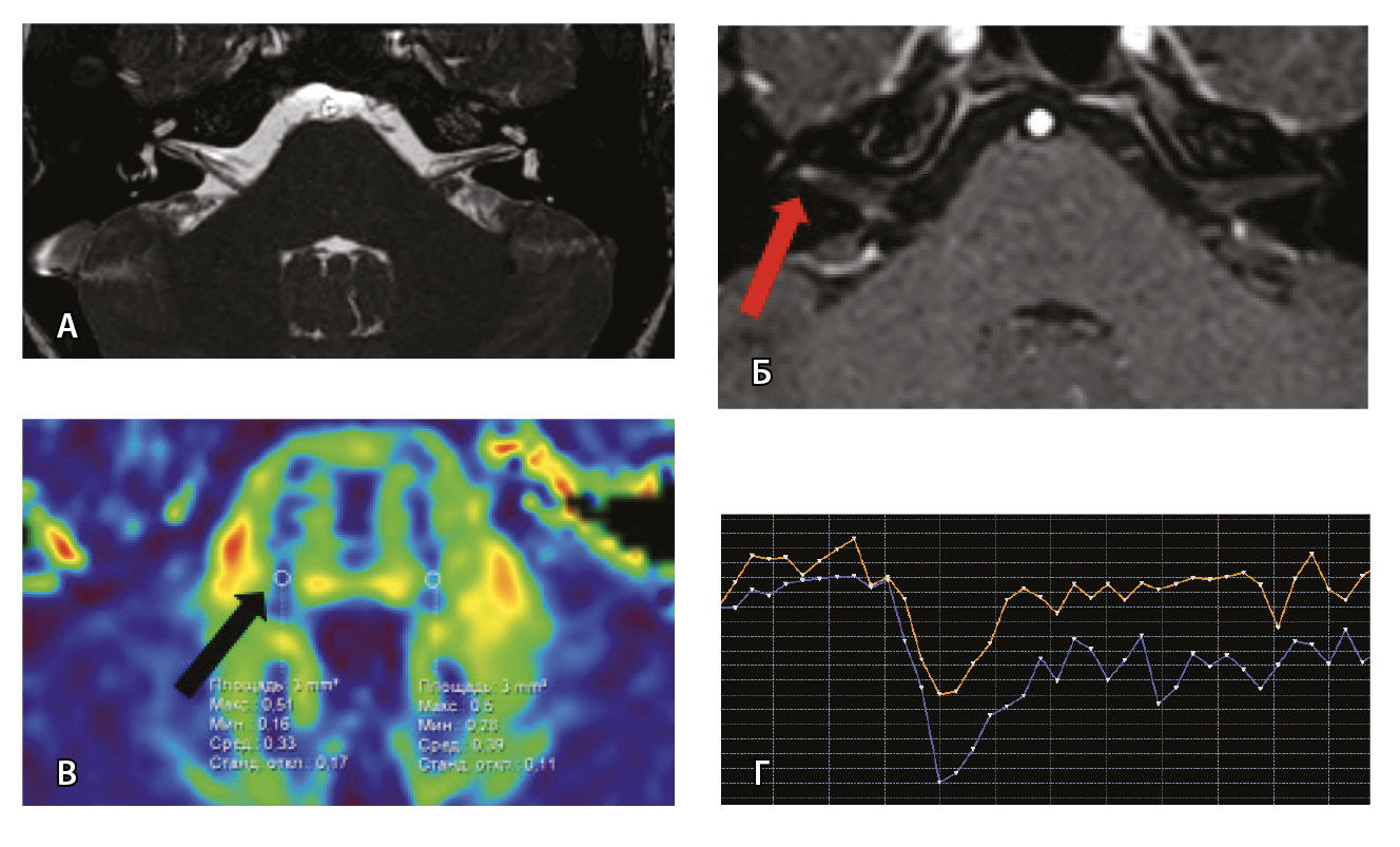 Рис. 6. Пациентка З. Магнитно-резонансная томография (МРТ) головного мозга: А – прицельная T2-SSFP на область мосто-мозжечкового угла; Б – Т1-взвешенное изображение с контрастным усилением; В – диффузионно-тензорная МРТ (фракционная анизотропия, ФА); Г – Т2*-перфузия. На изображении T2-SSFP патологические изменения на уровне прохождения лицевых нервов во внутренних слуховых проходах не определяются (А). При контрастировании отмечается накопление контрастного вещества правым лицевым нервом во внутреннем слуховом проходе (Б, красная стрелка). На уровне моторных ядер лицевого нерва в заднем отделе варолиевого моста на изображениях ФА на стороне поражения отмечается минимальное уменьшение показателя ФА до 0,33 (В, черная стрелка) и признаки гипоперфузии справа (Г, оранжевый график) по сравнению с контралатеральной стороной (Г, синий график). Данный пример демонстрирует типичные изменения при мультипараметрической МРТ у пациента с параличом Белла