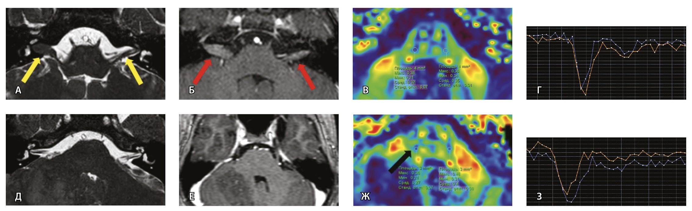 Клиническое наблюдение 3, пациент 13 лет (Д, Е, Ж, З). МРТ головного мозга: Д – прицельная T2-SSFP на область мосто-мозжечкового угла; Е – Т1-взвешенное изображение с контрастным усилением; Ж – диффузионно-тензорная МРТ (ФА); З – Т2*-перфузия. На изображении T2-SSFP патологические изменения на уровне прохождения лицевых нервов во внутренних слуховых проходах не определяются (Д). В медиальном отделе правого полушария мозжечка определяется объемное образование, компримирующее стенку IV желудочка и задний отдел варолиевого моста без признаков васкуляризации (Е). На уровне моторных ядер лицевого нерва в заднем отделе варолиевого моста на изображениях ФА на стороне поражения отмечается минимальное уменьшение показателя ФА до 0,27 (Ж, черная стрелка) и признаки гипоперфузии (З, оранжевый график) по сравнению с контралатеральной стороной (З, синий график)