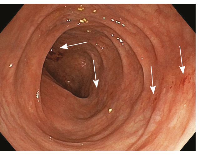 Рис. 2. Очаговый геморрагический колит после перенесенной инфекции SARS-CoV-2. У больной 74 лет эндоскопически визуализируются очаговые геморрагии (отмечены стрелками) на фоне гиперемированной слизистой, сохраненный сосудистый рисунок