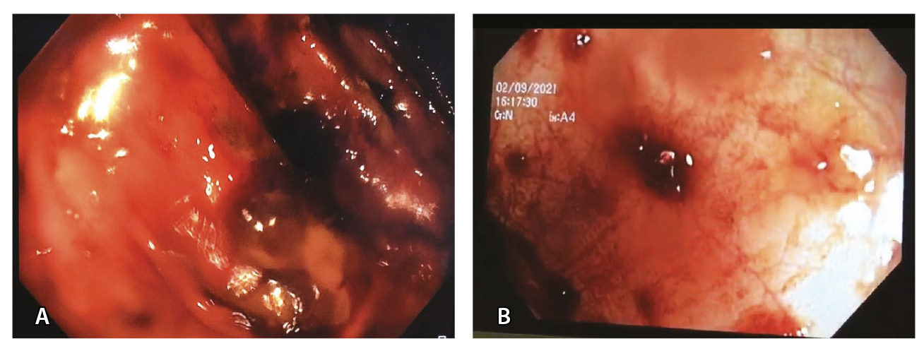 Рис. 3. Эндоскопическая картина язвенного колита умеренной активности (А; больной 38 лет) и высокой активности (Б; больной 47 лет), впервые возникшего после перенесенной инфекции SARS-CoV-2