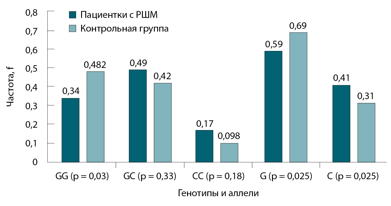 Генотип GG встречался в 1,42 раза реже в группе пациентов с РШМ в сравнении с контрольной группой (34 и 48,2% соответственно). Частота гетерозиготного и минорного генотипов GС и СС увеличивалась в 1,2 и 1,7 раза соответственно, но их распределение не было статистически значимым (р = 0,33 и р = 0,18). Анализ различий в распределении аллелей в основной группе (РШМ+) и группе сравнения (РШМ-) показал статистически значимые результаты: предковая аллель G встречалась в 1,2 раза реже (у 59% против 69%, р = 0,025), а минорная аллель С – в 1,32 раза чаще (у 41% против 31%, р = 0,025).