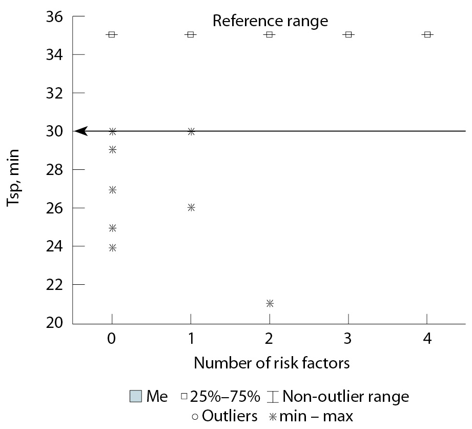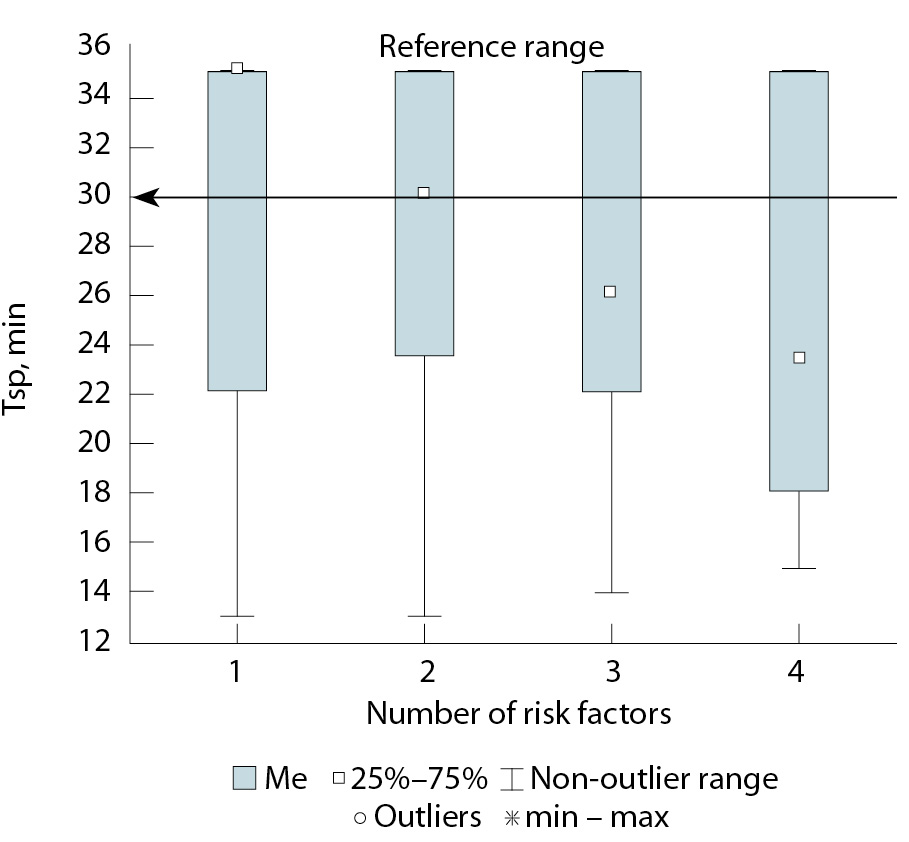 Рис. 2. Параметр теста тромбодинамики Tsp в группе женщин, не принимающих гормональную контрацепцию, в зависимости от количества факторов риска венозных тромбоэмболических осложнений