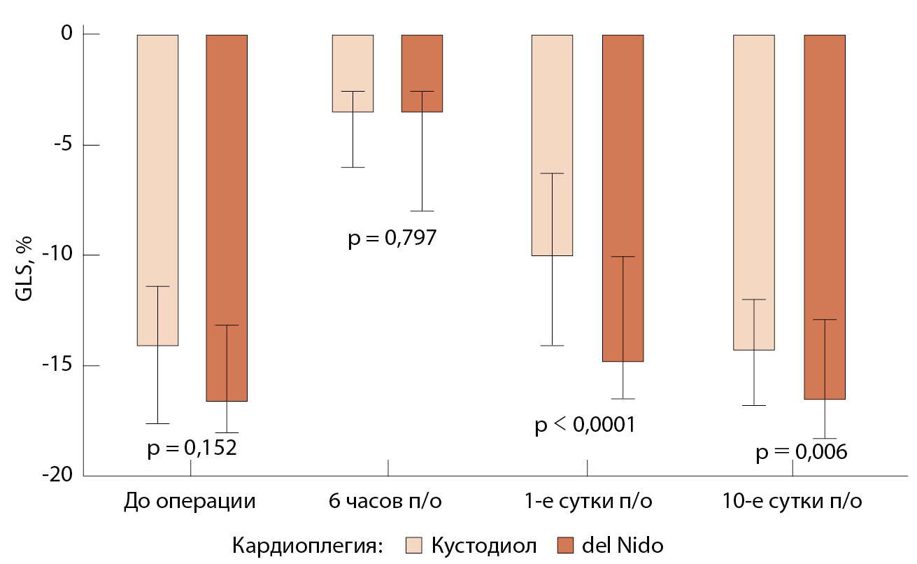 GLS ЛЖ на 10-е сутки после операции, % | -16,5 [-18,3; -12,9] | -14,3 [-16,8; -12,9] | 0,006 |