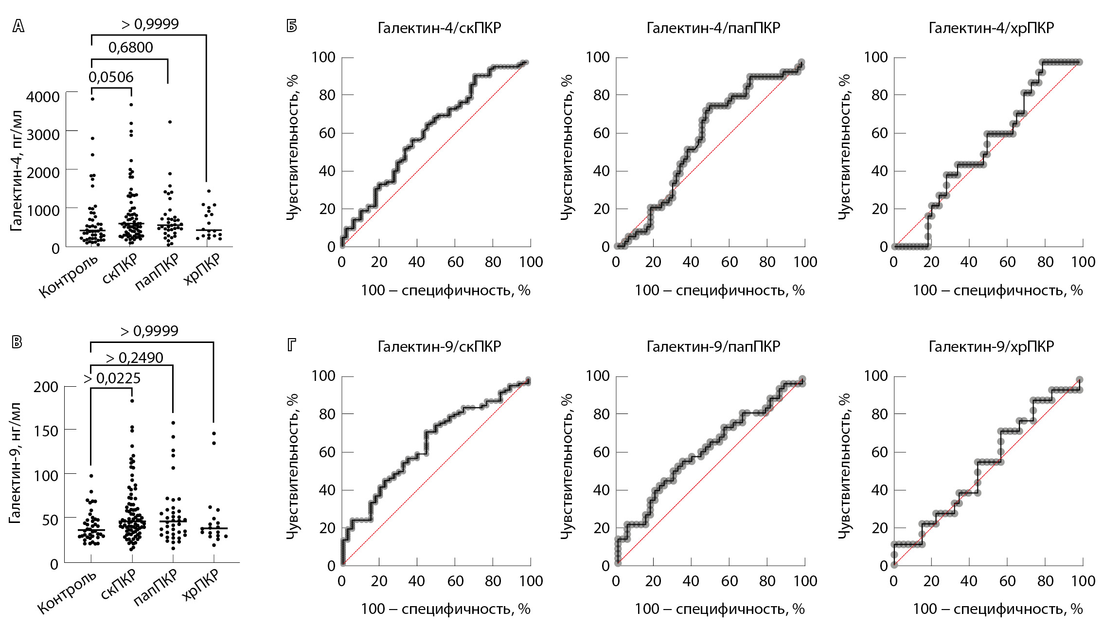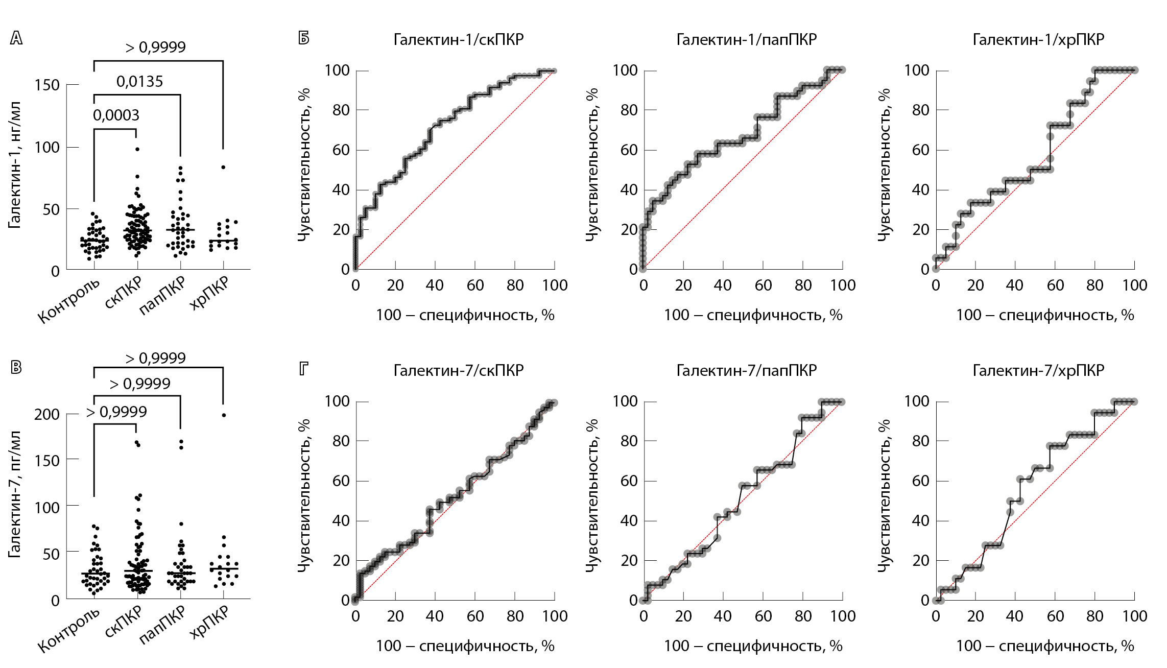 Провели анализ содержания галектинов -1 и -7 в сыворотке крови больных ПКР в сравнении со здоровыми донорами (рис. 1). Содержание галектина-1 в сыворотке крови было выше у больных скПКР и папПКР по сравнению со здоровыми донорами, однако площадь под ROC-кривой, равная 0,721 для скПКР и 0,673 для папПКР, свидетельствует о среднем качестве модели, что не позволяет использовать полученные данные в диагностических целях. Для галектина-7 не выявлено различий в содержании данного белка между группами контроля и больных ПКР.
