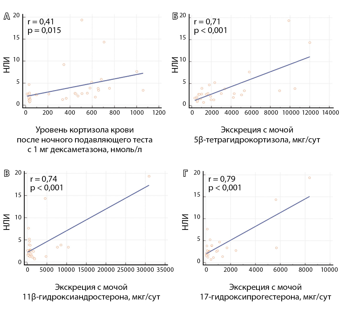 Рис. 2. Зависимость величины нейтрофильно-лимфоцитарного индекса (НЛИ) от уровня кортизола крови после ночного подавляющего теста с 1 мг дексаметазона (А), экскреции 5β-тетрагидрокортизола с мочой (Б), экскреции 11β-гидроксиандростерона с мочой (В), экскреции 17-гидроксипрогестерона с мочой (Г)