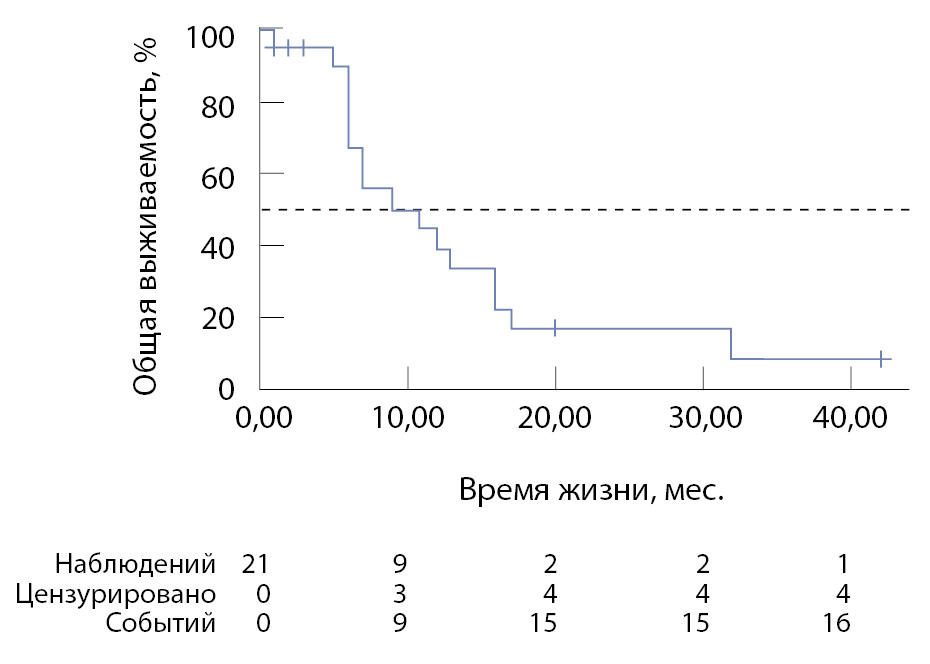 В группе ПДР с резекцией печени медиана общей выживаемости составила 11 [95% ДИ 6–16] месяцев; показатели общей 1-, 2- и 3-летней выживаемости – 39,2, 16,8 и 7,2% соответственно (рис. 1).