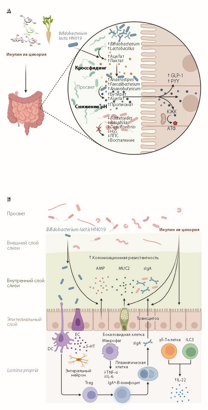 Возможные механизмы действия и полезные эффекты синбиотика на основе пробиотического штамма Bifidobacterium lactis HN019 и инулина из цикория. А – ферментация инулина из цикория микробиотой кишечника с продукцией КЖК. Ферментация инулина в толстой кишке как индигенными бифидобактериями, так и пробиотическим штаммом Bifidobacterium lactis HN019 сопровождается прежде всего снижением внутрипросветного pH, продукцией ацетата и лактата и увеличением численности бифидобактерий (бифидогенный эффект), лактобацилл и бутират-продуцирующих бактерий (Anaerostipes, Faecalibacterium, Anaerobutyricum). Ацетат и лактат используются последними для продукции бутирата в процессе кроссфидинга. Некоторые комменсальные бактерии также продуцируют пропионат при ферментации инулина. Бутират, ацетат и пропионат – основные КЖК, обладающие противовоспалительными, иммуномодулирующими и метаболическими эффектами, регулируют энергетический гомеостаз в колоноцитах (бутират) и способствуют секреции кишечных пептидных гормонов GLP-1 и PYY, улучшая метаболизм глюкозы и снижая резистентность к инсулину. Инулин также уменьшает численность потенциальных патобионтов (Bacteroides, Bilophila, Desulfovibrio), связанных с провоспалительным иммунным ответом и метаболической эндотоксемией, способствуя уменьшению продукции H2S и снижению уровня ЛПС. Bifidobacterium lactis HN019 продуцирует лактат и ацетат, участвуя в кроссфидинге; стимулирует перистальтику кишечника, способствуя биосинтезу серотонина энтерохромаффинными клетками и метаболизму желчных кислот комменсальными бактериями. Б – иммуномодулирующие эффекты инулина и Bifidobacterium lactis HN019. Инулин регулирует дифференциацию и пролиферацию иммунных клеток (в том числе Treg), уменьшая воспаление в кишечнике; повышает экспрессию белков плотных контактов, индуцирует секрецию sIgA и MUC2 плазматическими и бокаловидными клетками и способствует секреции IL-22 γδ-T-клетками и ILC3, поддерживая гомеостаз кишечного барьера. Bifidobacterium lactis HN019 подавляет колонизацию патогенных бактерий, в том числе путем усиления секреции антимикробных пептидов; повышает экспрессию белков плотных контактов и стимулирует секрецию sIgA, укрепляя кишечный барьер; снижает выработку макрофагами цитокинов TNF-α и IL-6, связанных с хроническим воспалением и метаболическими нарушениями; повышает активность NK-клеток, участвующих в поддержании врожденного иммунитета, и усиливает фагоцитарную способность полиморфноядерных лейкоцитов. AMP (antimicrobial peptides) – антимикробные пептиды; DC (dendritic cell) – дендритная клетка; EC (enterochromaffin cell) – энтерохромаффинная клетка; GLP-1 (glucagon-like peptide 1) – глюкагоноподобный пептид 1; H2S – сероводород; IL-6 (interleukin 6) – интерлейкин-6; IL-22 (interleukin 22) – интерлейкин-22; ILC3 (innate lymphoid cell 3) – врожденная лимфоидная клетка 3-го типа; MUC2 (mucin 2) – муцин-2; PYY (peptide YY) – пептид YY; sIgA (secretory immunoglobulin A) – секреторный иммуноглобулин A; TNF-α (tumor necrosis factor α) – фактор некроза опухоли альфа; Treg (regulatory T cell) – регуляторный T-лимфоцит; АТФ – аденозинтрифосфат; КЖК – короткоцепочечные жирные кислоты; ЛПС – липополисахарид; 5-НТ – серотонин (5-гидрокситриптамин). Создано с помощью BioRender.com