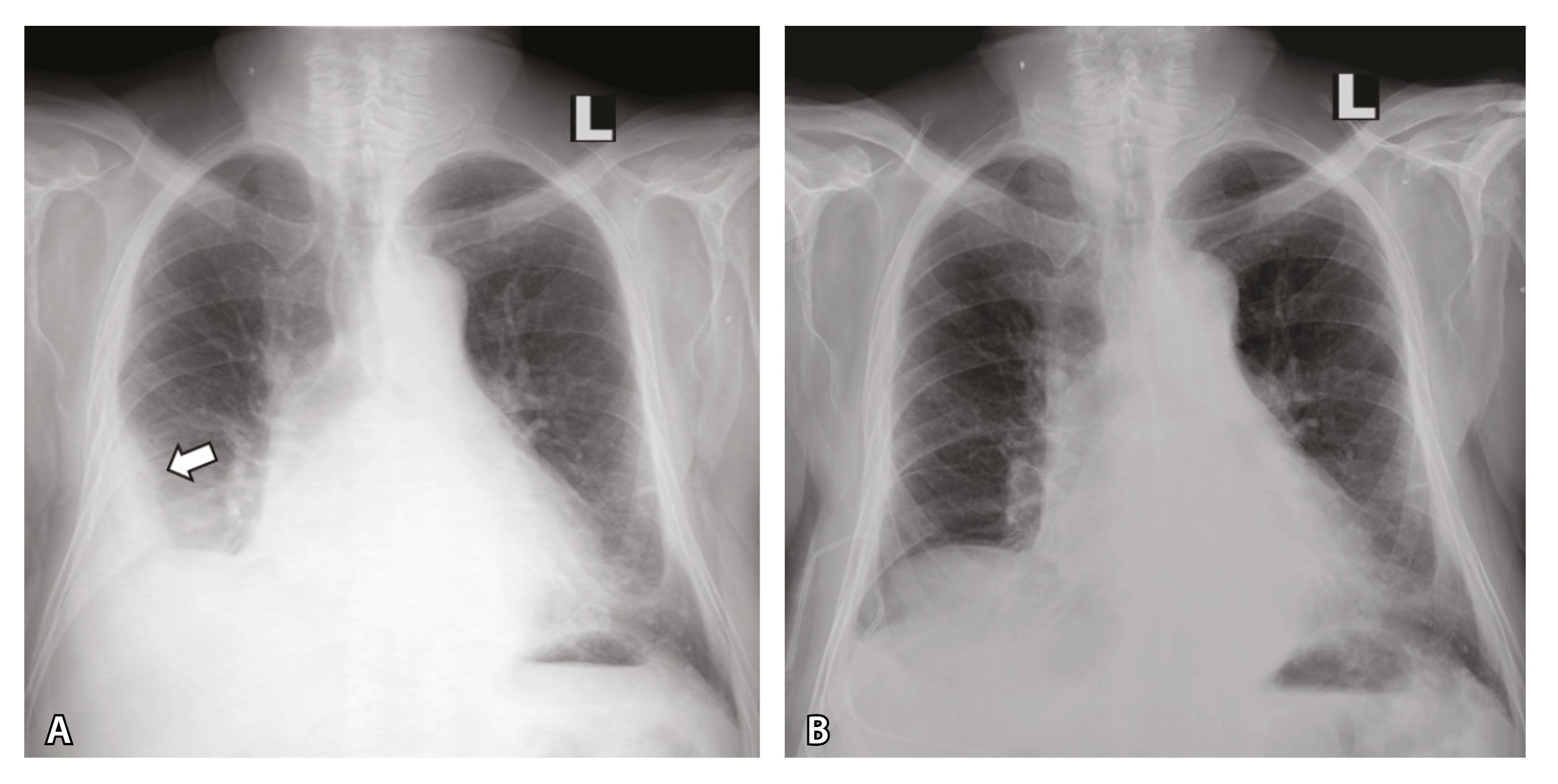 Рис. 2. Рентгенограмма органов грудной клетки пациента до (А) и после (Б) плевральной пункции. Стрелкой указан косой верхний контур уровня жидкости в правой плевральной полости на уровне переднего отрезка 4-го ребра. Синусы слева прослеживаются. Тень сердца расширена