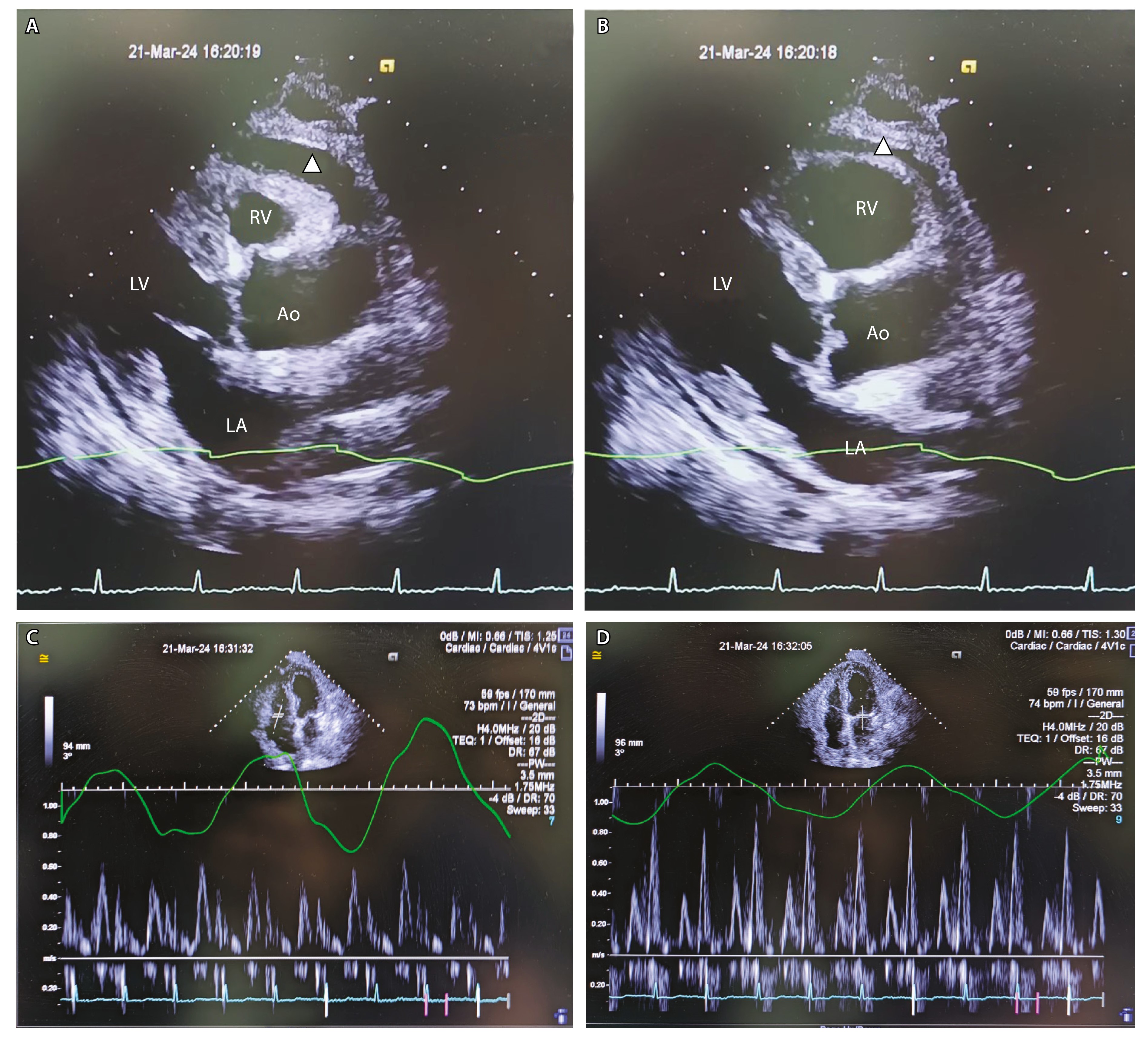 Рис. 3. Эхокардиограмма пациента: А – парастернальная позиция, длинная ось ЛЖ, систола; Б – парастернальная позиция, длинная ось ЛЖ, диастола; В – доплеровское исследование транстрикуспидального кровотока; Г – доплеровское исследование трансмитрального кровотока. Ао – аорта, ЛЖ – левый желудочек, ЛП – левое предсердие, ПЖ – правый желудочек. Белый треугольник указывает прослойку жидкости в перикарде