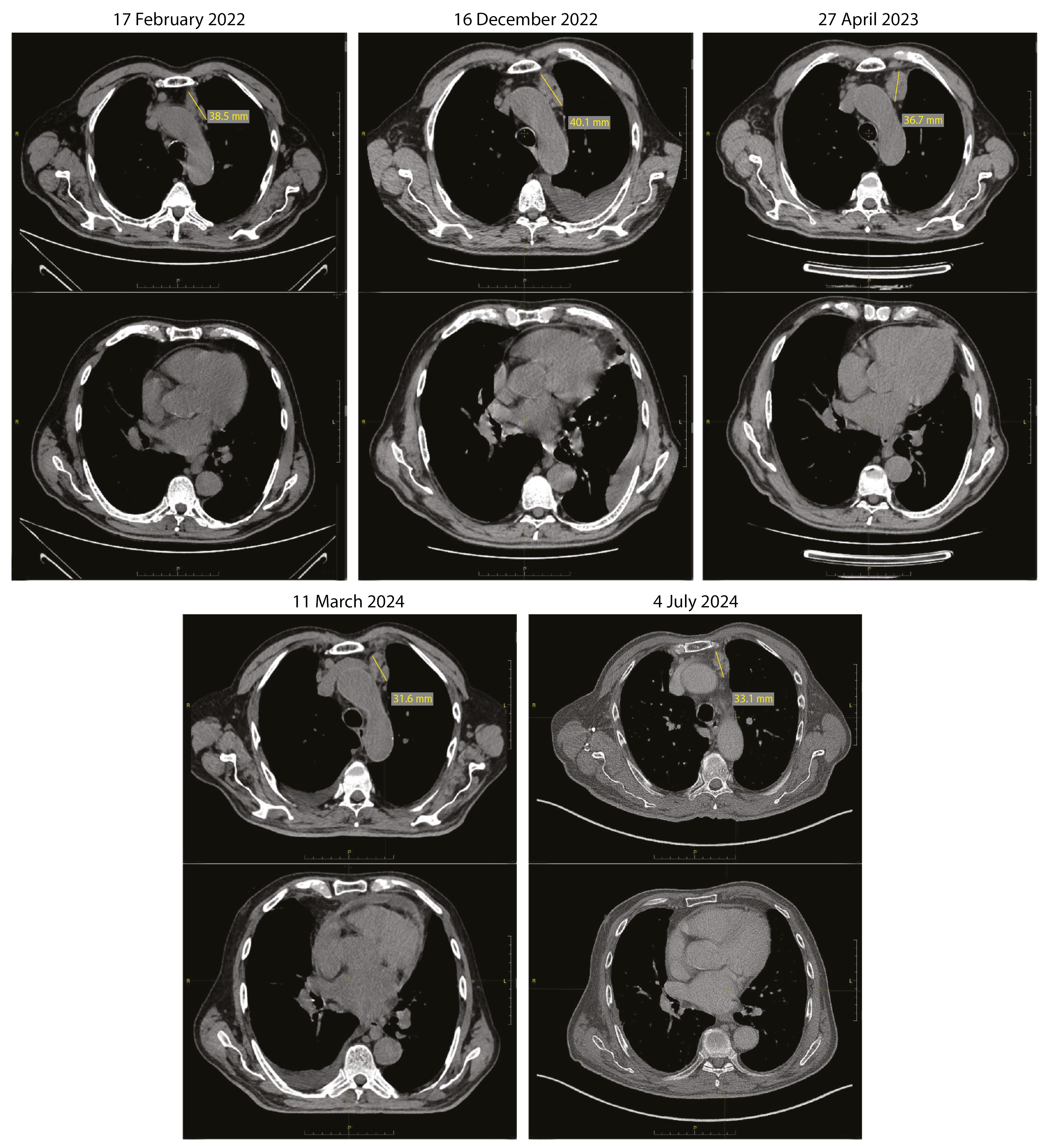 Обсуждалась возможность выполнения радиочастотной аблации для лечения ФП. Проведена компьютерная томография (КТ) легочных вен и ЛП с контрастированием (15.03.2024): объем ЛП с учетом ушка – 120 мл (N – 68,1 ± 14,8 мл). Данных за тромбоз ушка ЛП нет. Легочные вены расположены типично. Толщина слоя выпота в полости перикарда увеличилась до 9 мм. Определялся конгломерат лимфатических узлов в верхнем средостении размерами 37 × 24 мм, в других группах – до 11 мм по короткой оси.