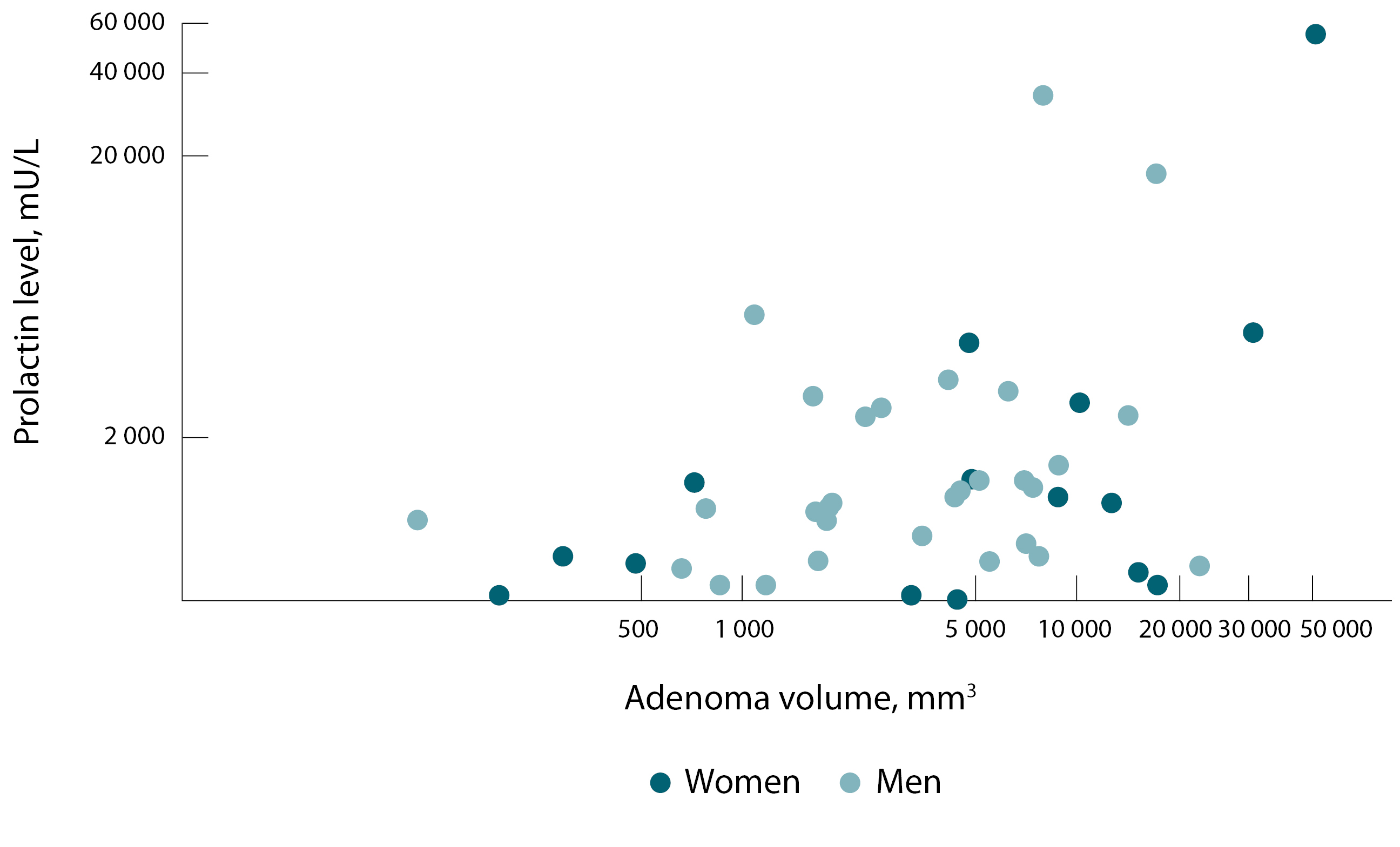 Рис. 2. Распределение уровня пролактина в зависимости от объема аденомы гипофиза среди пациентов женского и мужского пола (логарифмическая шкала)