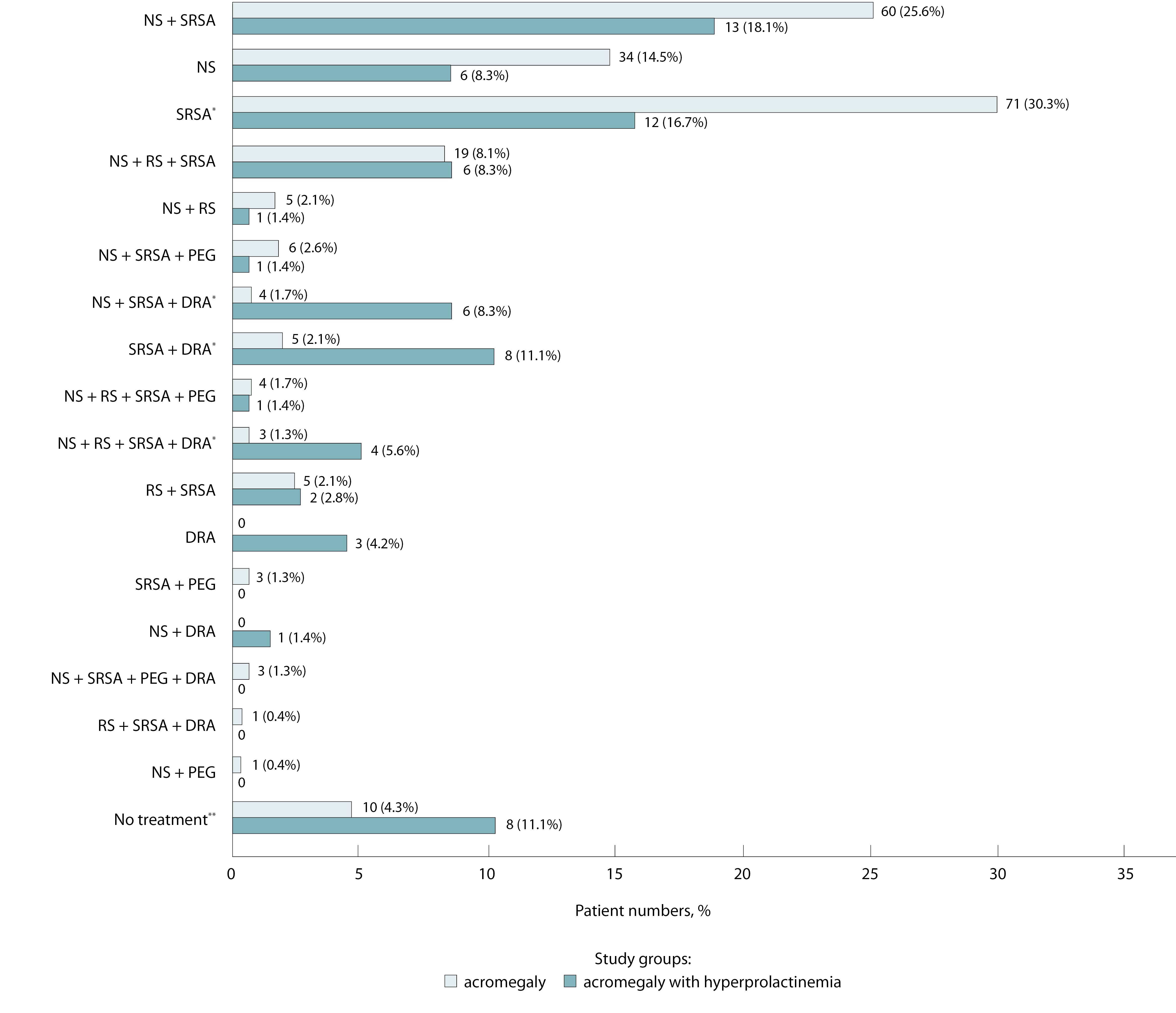 В группе с акромегалией и гиперпролактинемией чаще использовались АгД как в монотерапии, так и в комбинированных схемах лечения по сравнению с группой пациентов с акромегалией – 22/72 (30,6%) и 16/234 (6,8%) соответственно (р < 0,001) (рис. 3). Монотерапию АгД получали 3 пациента с акромегалией и гиперпролактинемией, 2 из них удалось достичь ремиссии заболевания. Из 8 пациентов, находившихся на комбинированной схеме терапии аналогами соматостатина первого поколения (АСС) и АгД, 1 пациент достиг ремиссии заболевания. В группе пациентов с акромегалией 5 человек получали комбинированное лечение АСС и АгД, все пациенты достигли ремиссии заболевания. Монотерапия АгД в данной группе не применялась. За счет частого использования комбинации АСС и АгД в качестве первичного медикаментозного лечения частота монотерапии АСС была ниже в группе с гиперпролактинемией. Однако в целом статистически значимой разницы в достижении контроля над заболеванием между двумя группами не было: контроль акромегалии отмечен у 153/234 (65,4%) пациентов без гиперпролактинемии и у 40/72 (55,6%) пациентов с гиперпролактинемией (р = 0,095).